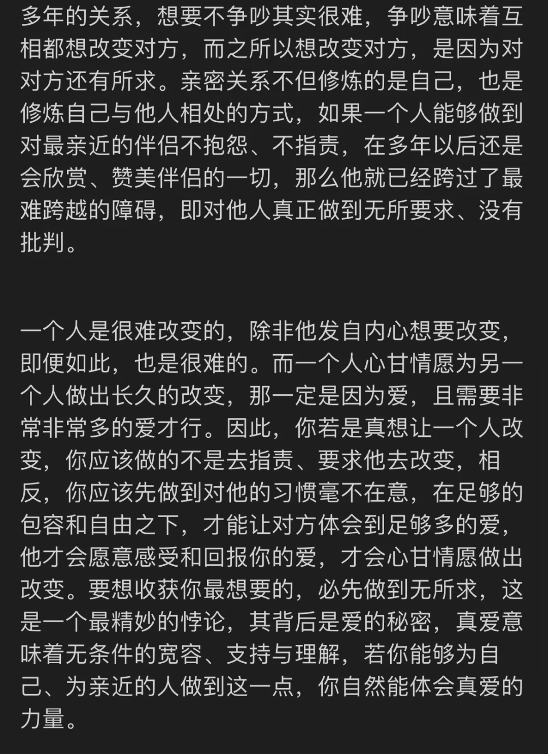 亲密关系不但修炼的是自己,也是修炼自己与他人相处的方式,如果一个人能够做到对最亲近的伴侣不抱怨、不指责,在多年以后还是会欣赏、赞美伴侣的一切,那么他就已经跨过了最难跨越的障碍,即对他人真正做到无所要求、没有批判。真爱意味着无条件的宽容、支持与理解,若你能够为自己、为亲近的人做到这一点,你自然能体会真爱的力量。