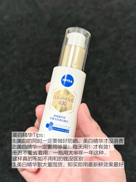 ❷白天用妮维雅630双能瓶,同时做好防晒,如果你追求亮的速度更快,且皮肤能耐受,可在第一步再加入抗氧化剂