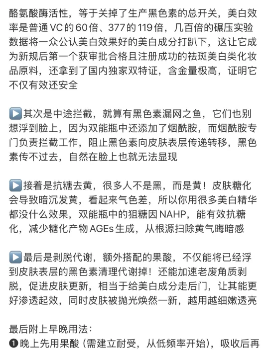 ▶️首先是源头抑黑,要真正变白,最关键就是从源头抑制黑色素生成,双能瓶中的Thiamidol 630,当初可是一经问世就让整个美白界大地震的恐怖存在,它能直接抑制酪氨酸酶活性,等于关掉了生产黑色素的总开关,美白效率是普通VC的60倍、377的119倍,几百倍的碾压实验数据将一众公认美白效果好的美白成分打趴下,这让它成为新规后第一个获审批合格且注册成功的祛斑美白类化妆品原料,还拿到了国内独家双特证,含金量极高,证明它不仅有效还安全