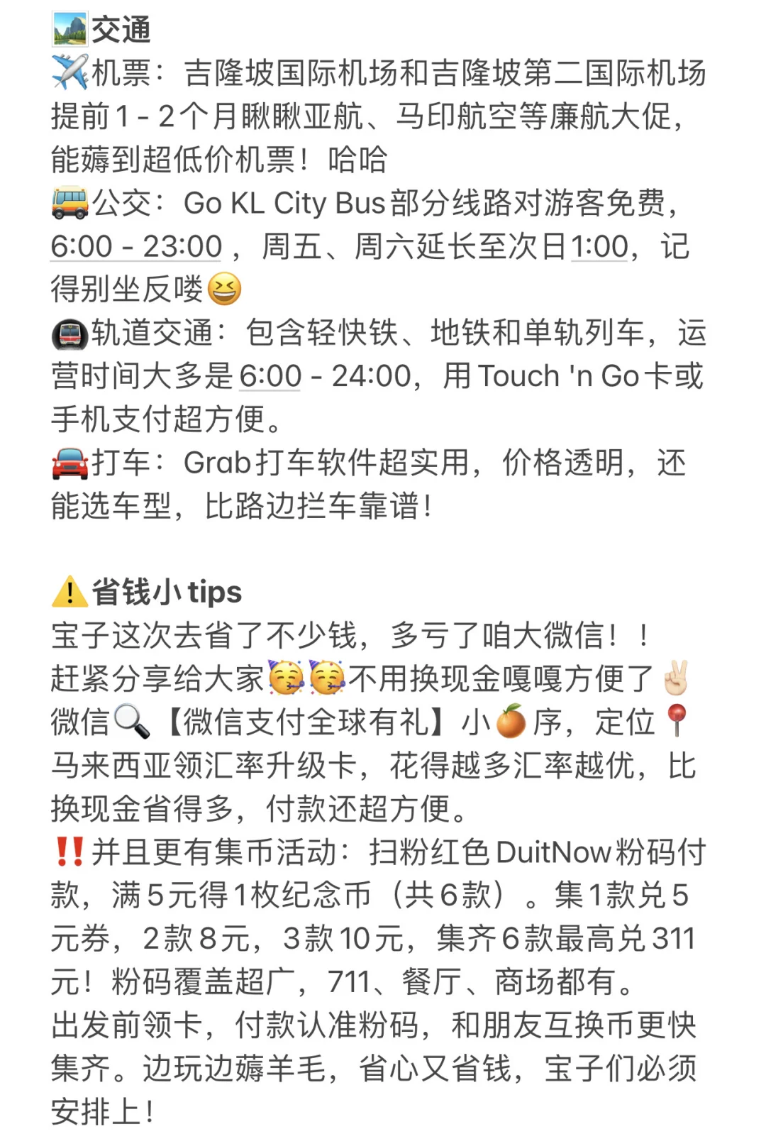 🚇轨道交通:包含轻快铁、地铁和单轨列车,运营时间大多是6:00 - 24:00,用Touch 'n Go卡或手机支付超方便。