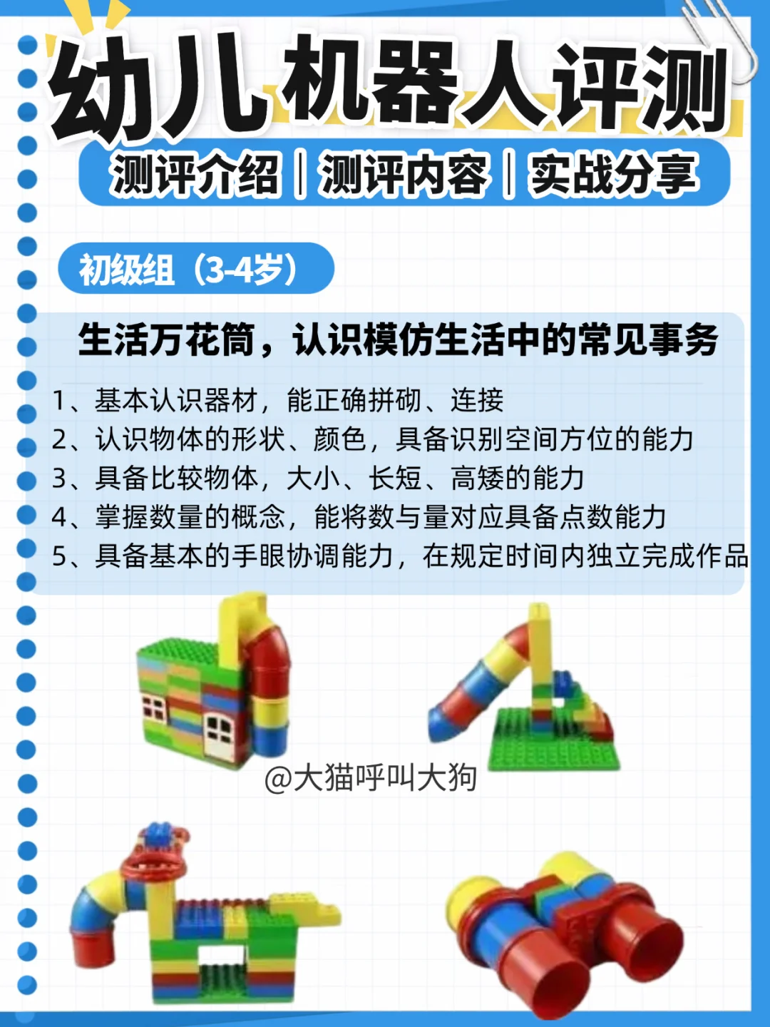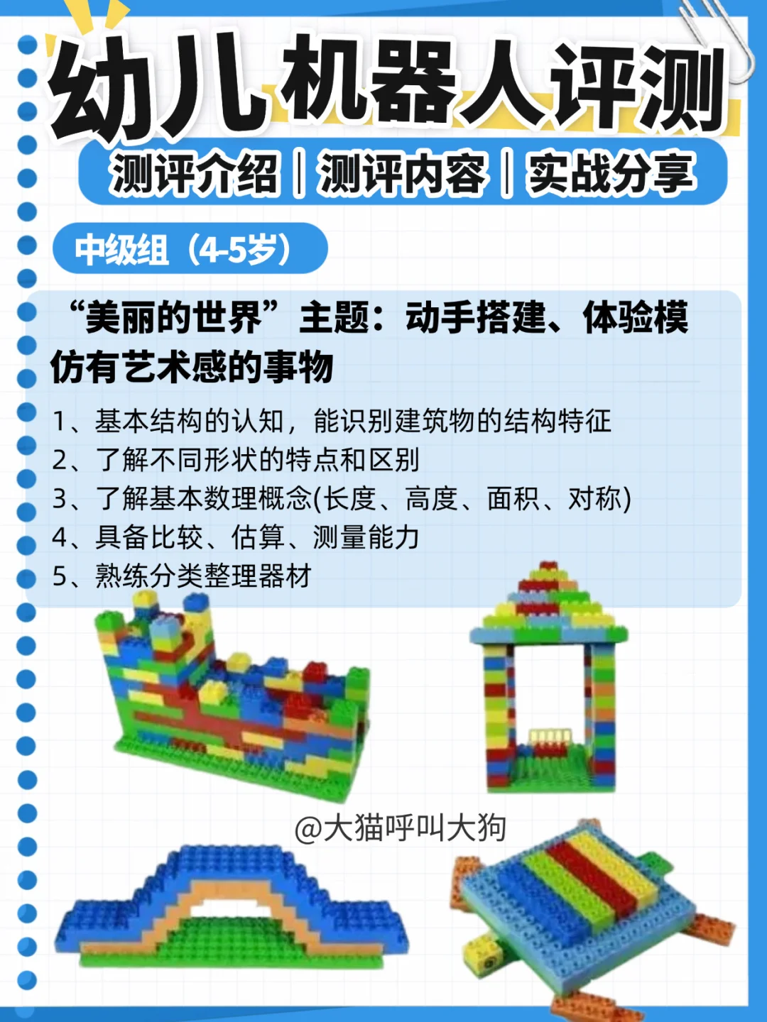 分初级中级高级,从图2-4中抽选对应级别的图,现场应该没提供图纸就是平时要记住怎么搭,家长不在考试教室内,分两部分实操+提问,提问可能是要介绍自己搭建思路和回答老师一些日常问题,应该不难