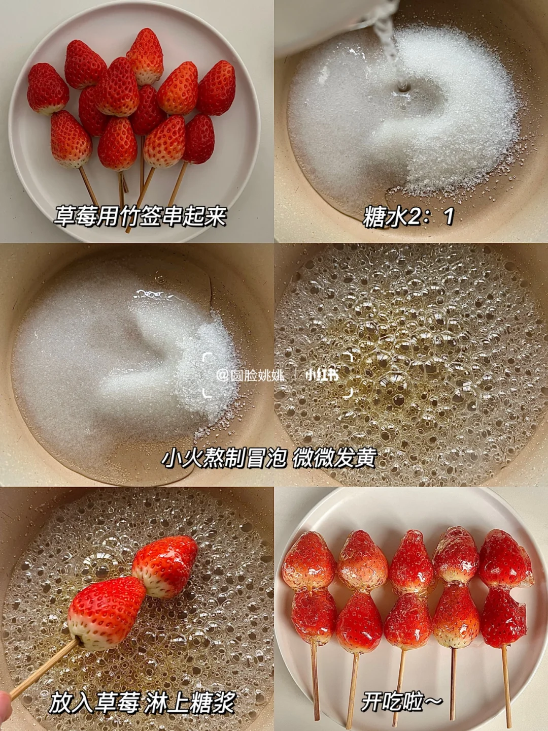 2⃣️糖水 2:1,小火熬糖中途不要搅拌!颜色微黄就要注意啦!放入草莓挂上糖浆就可以啦~