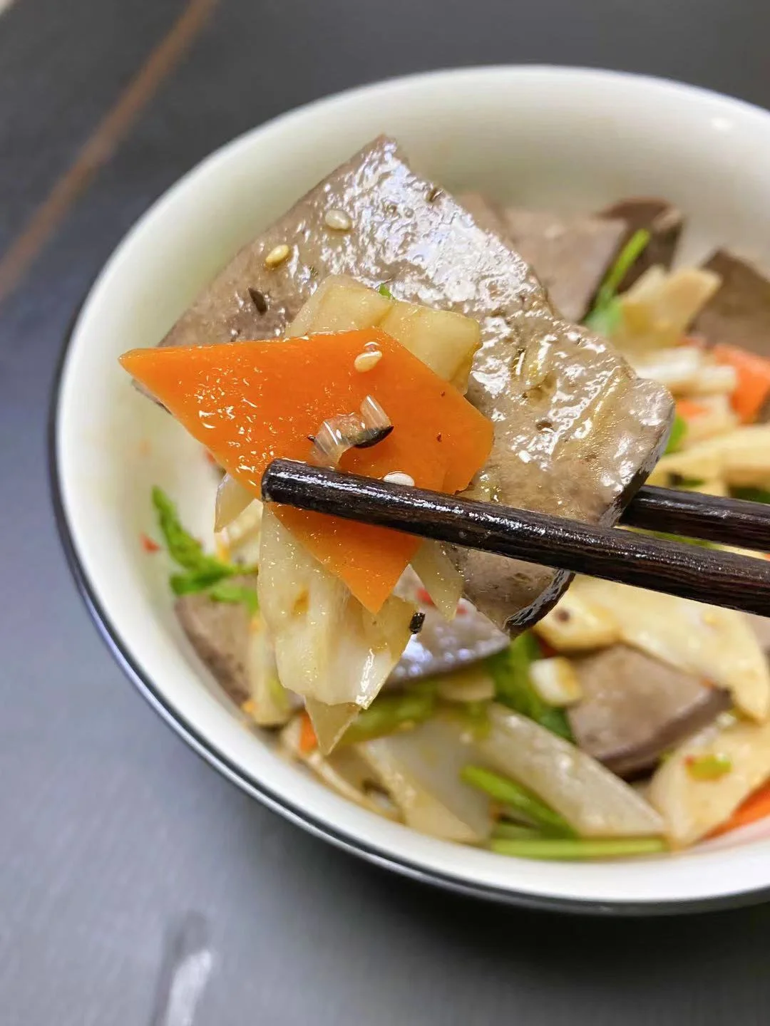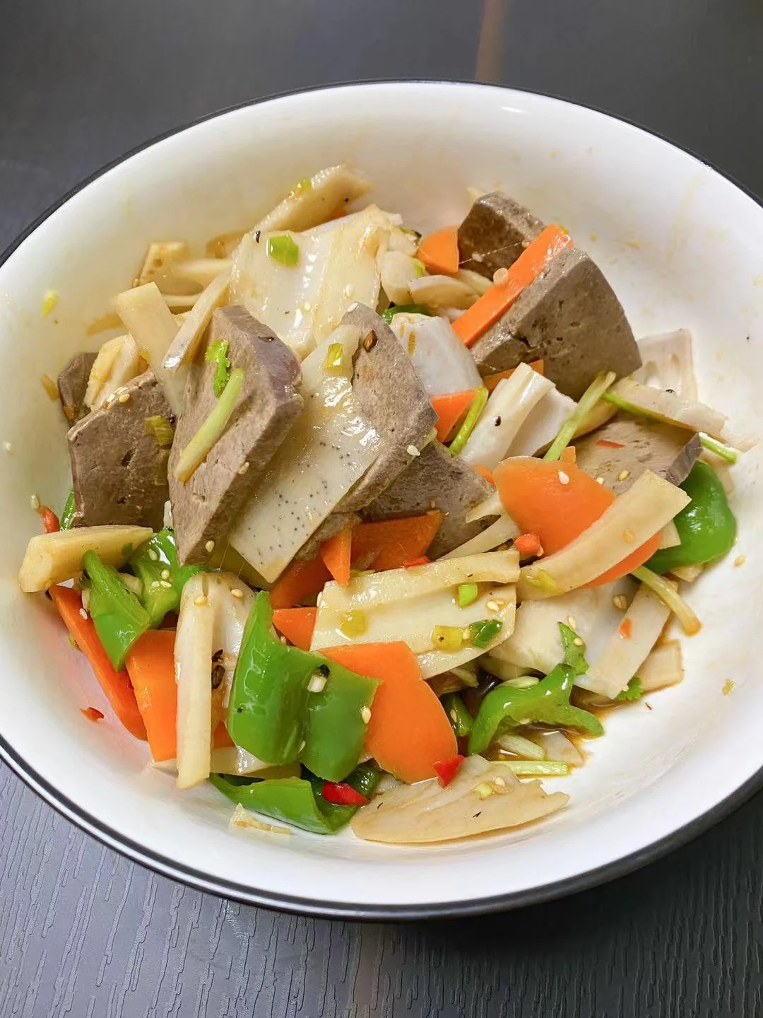 鲜猪肝1块、鲜藕1个、盐适量、胡萝卜🥕、青椒半个、卤料(八角、桂皮、花椒、香叶、干辣椒)、冰糖、老抽、香油、芝麻