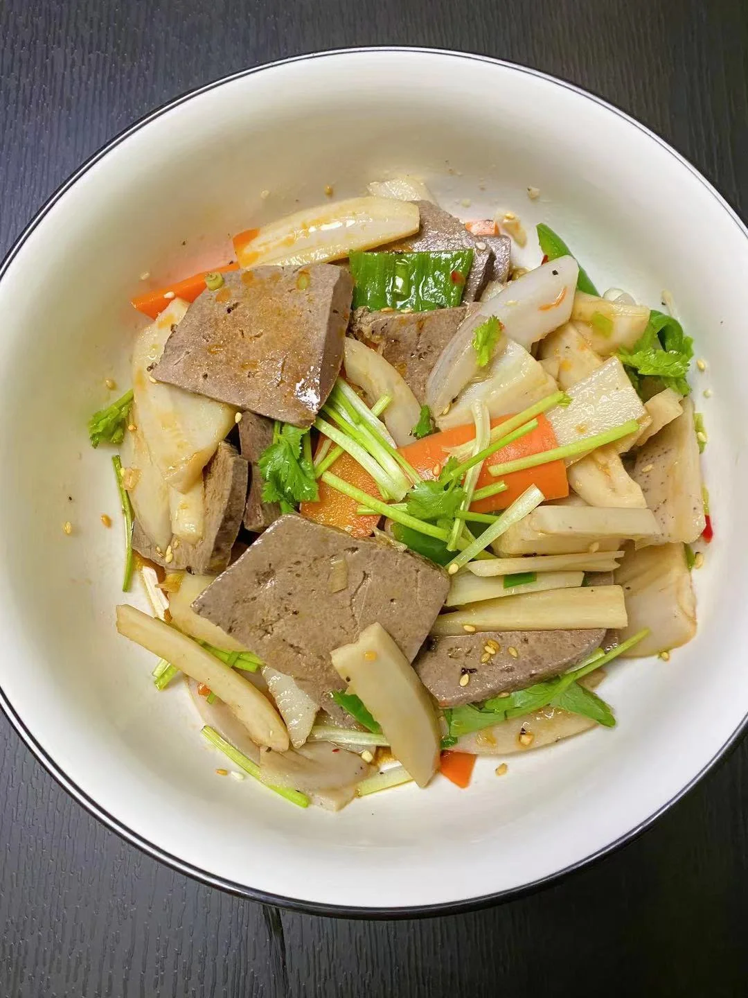 3、将猪肝切片和鲜藕片、胡萝卜、青椒片装碗加盐、葱花、生抽拌匀,然后把热油胶上,放入香菜、香醋拌匀即可开吃!