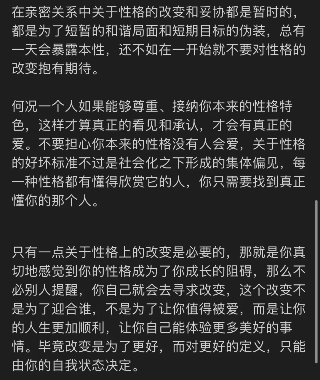 只有一种关于性格的改变是正面的,那就是你真实感受到,改变一下自己,会让人生更顺利。我们改变的目的是为了让自己过得更好,所以改变的契机只在于,你是否认为这样做会让你更好,而更好的标准,只能由你自身的状态决定。改变的主动权在你自己,而不是迎合别人。
