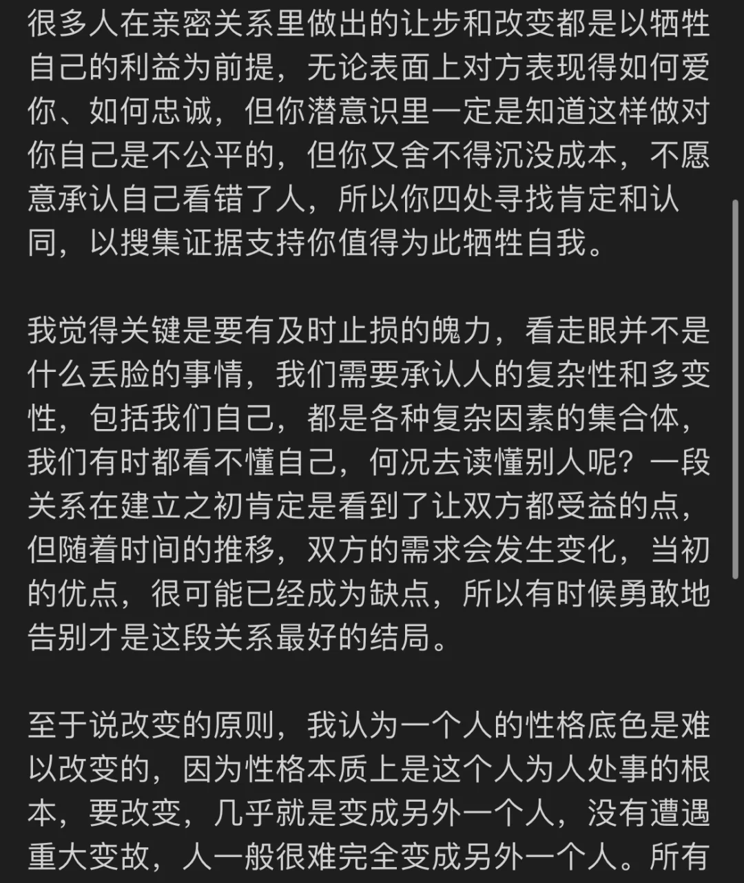 我认为在一段关系中,不是不可以为对方改变,而是必须要明确改变的界限,有些无伤大雅的事情,两个人需要轮流做出妥协,这是磨合的必要,但是关于你的人生重大决策,一定不要轻易让步。我认为亲密关系中改变的底线在于,你的性格本色,和你的人生未来走向。