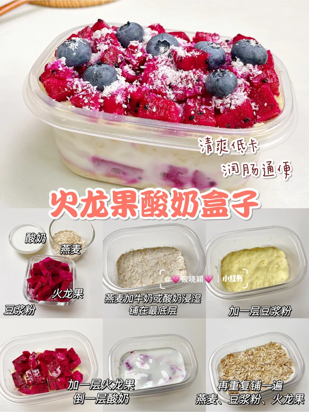 ①燕麦加牛奶或者酸奶浸湿铺在底层,加一层豆浆粉,一层火龙果,倒入酸奶