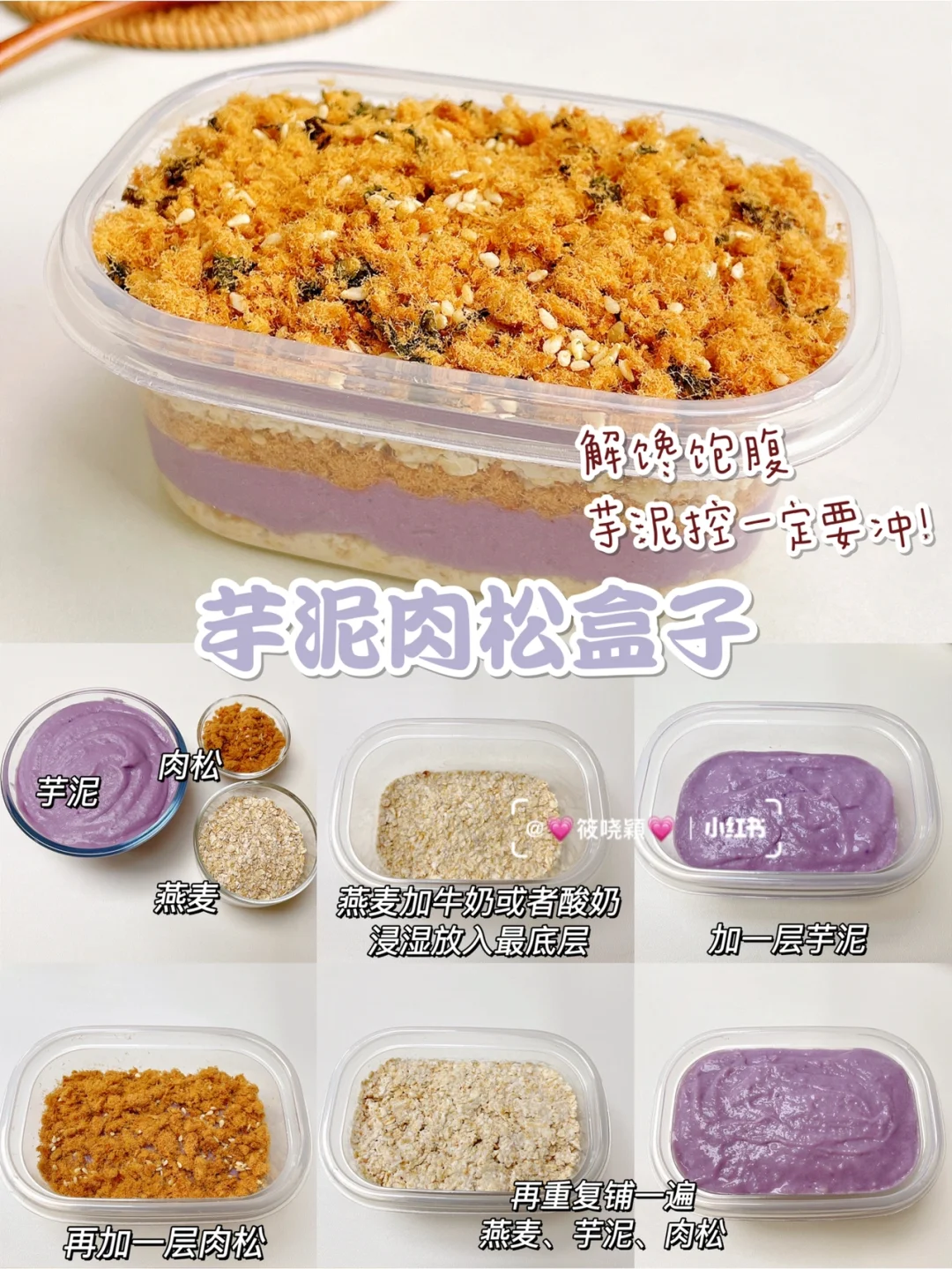 ①燕麦加牛奶或者酸奶浸湿铺在底层。加一层芋泥,撒一层肉松