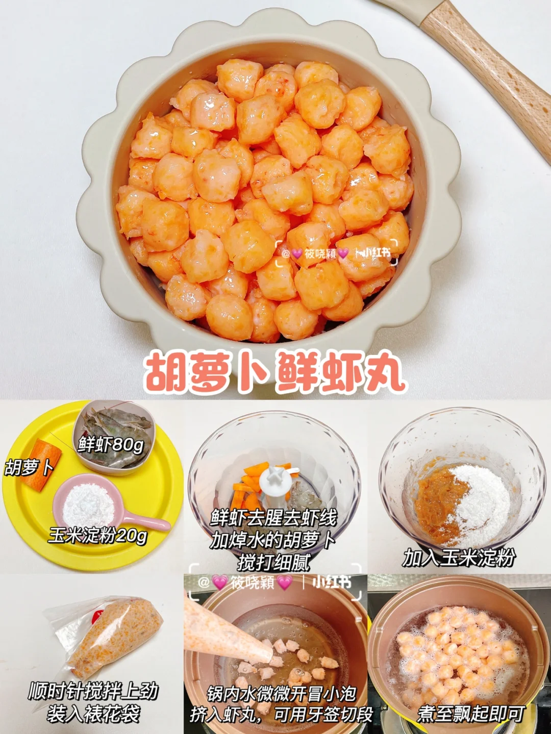 【食材:胡萝卜,虾80g,玉米淀粉20g】
