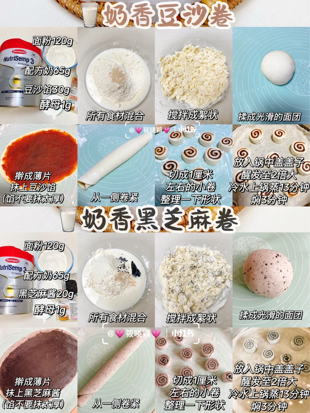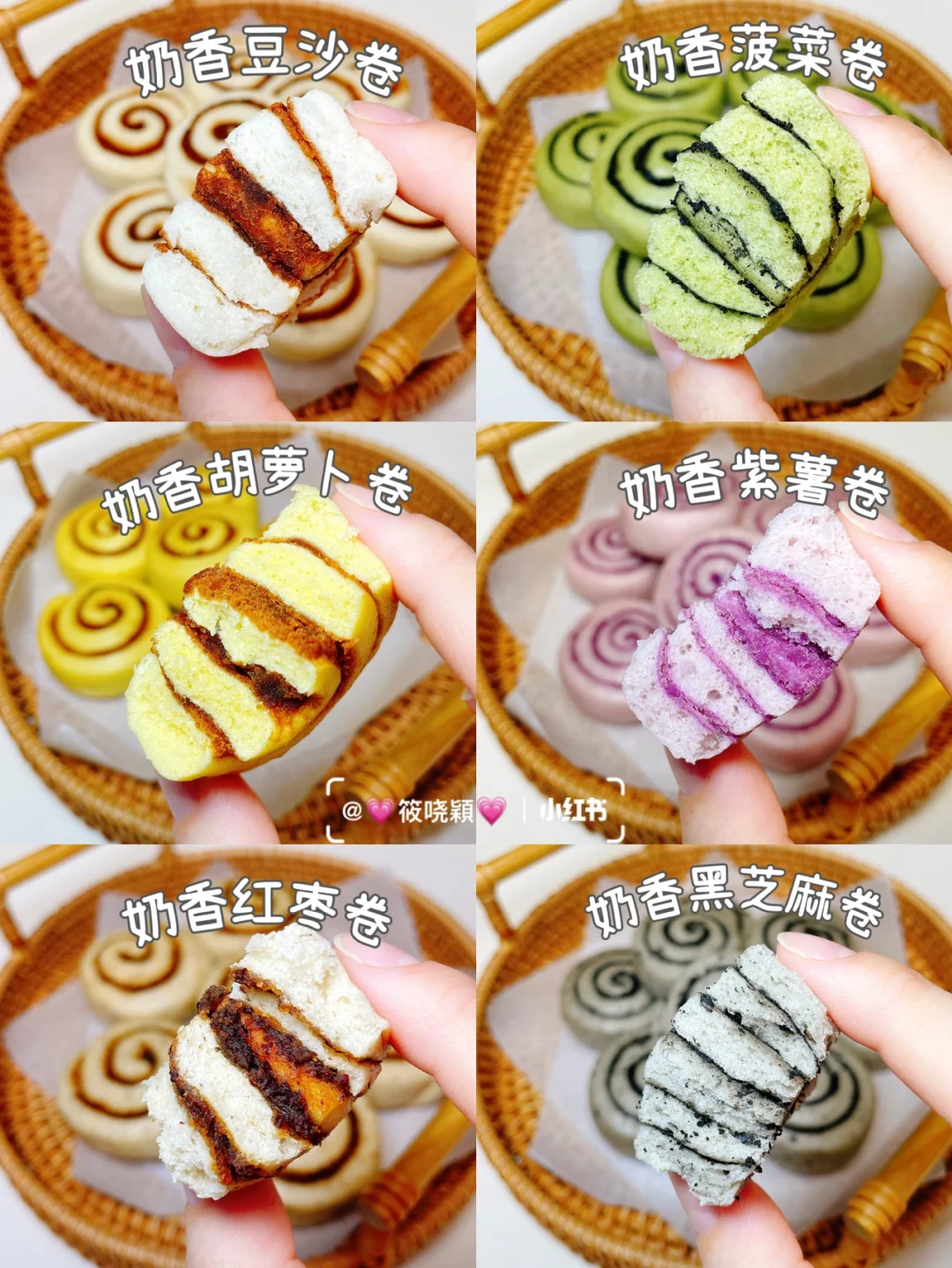 🌈馒头卷做法:所有食材混合搅拌成絮状,揉成光滑的面团,擀成薄片抹上馅料,从一侧卷紧,切成一厘米左右的小卷,整理形状放入锅内(不开火)盖盖子醒发至2倍大,冷水上锅蒸13分钟焖3分钟