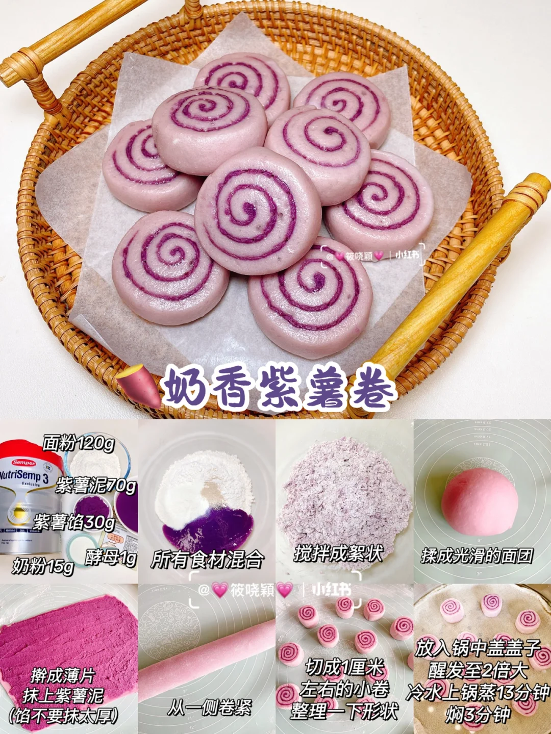🔸食材:面粉120g,紫薯泥70g,紫薯馅30g,奶粉15g,酵母1g