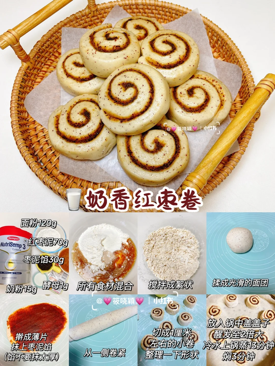 🔸食材:面粉120g,红枣泥70g,枣泥馅30g,奶粉15g,酵母1g