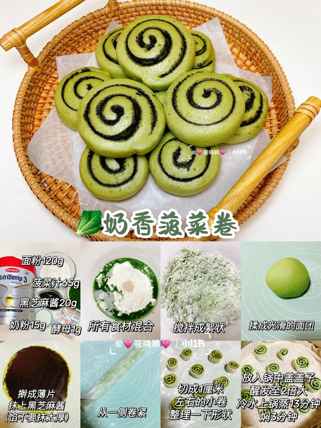 🔸食材:面粉120g,菠菜汁65g,黑芝麻酱20g,奶粉15g,酵母1g