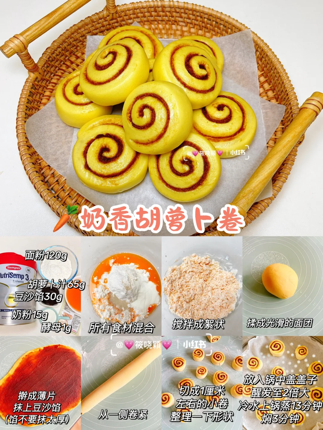 🔸食材:面粉120g,胡萝卜汁65g,豆沙馅30g,奶粉15g,酵母1g