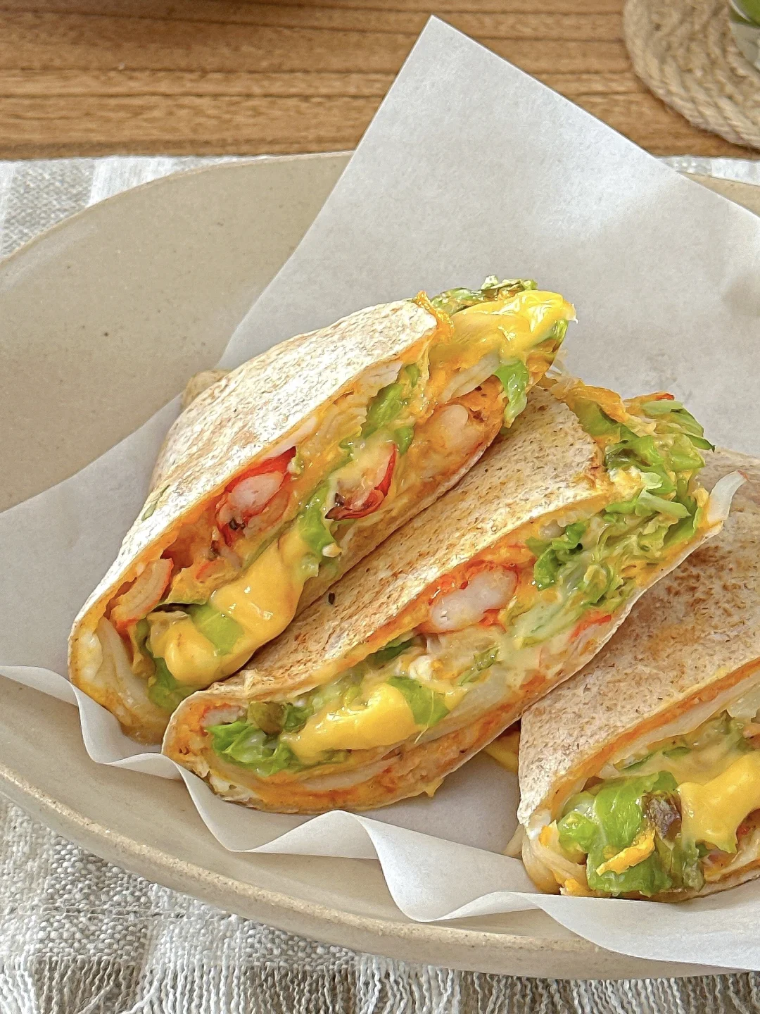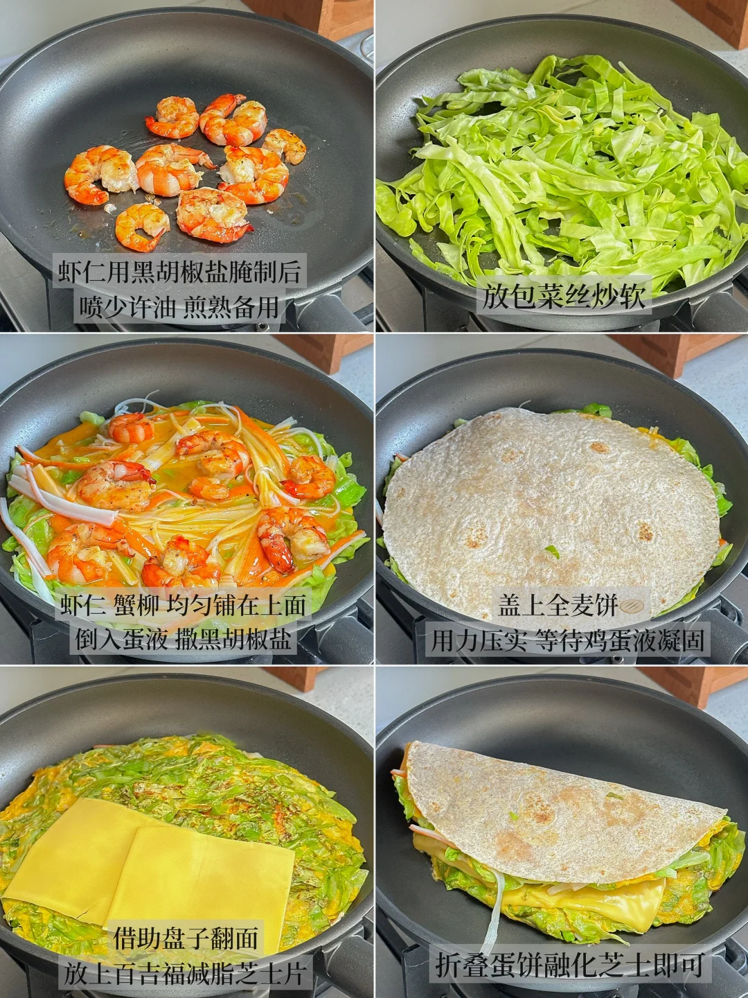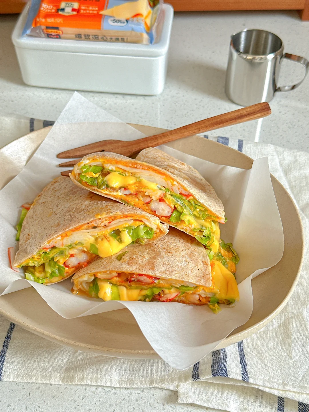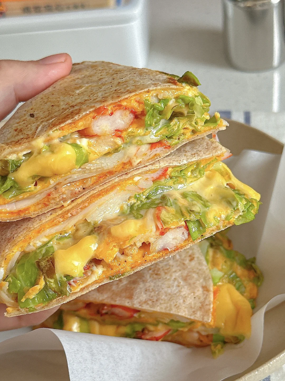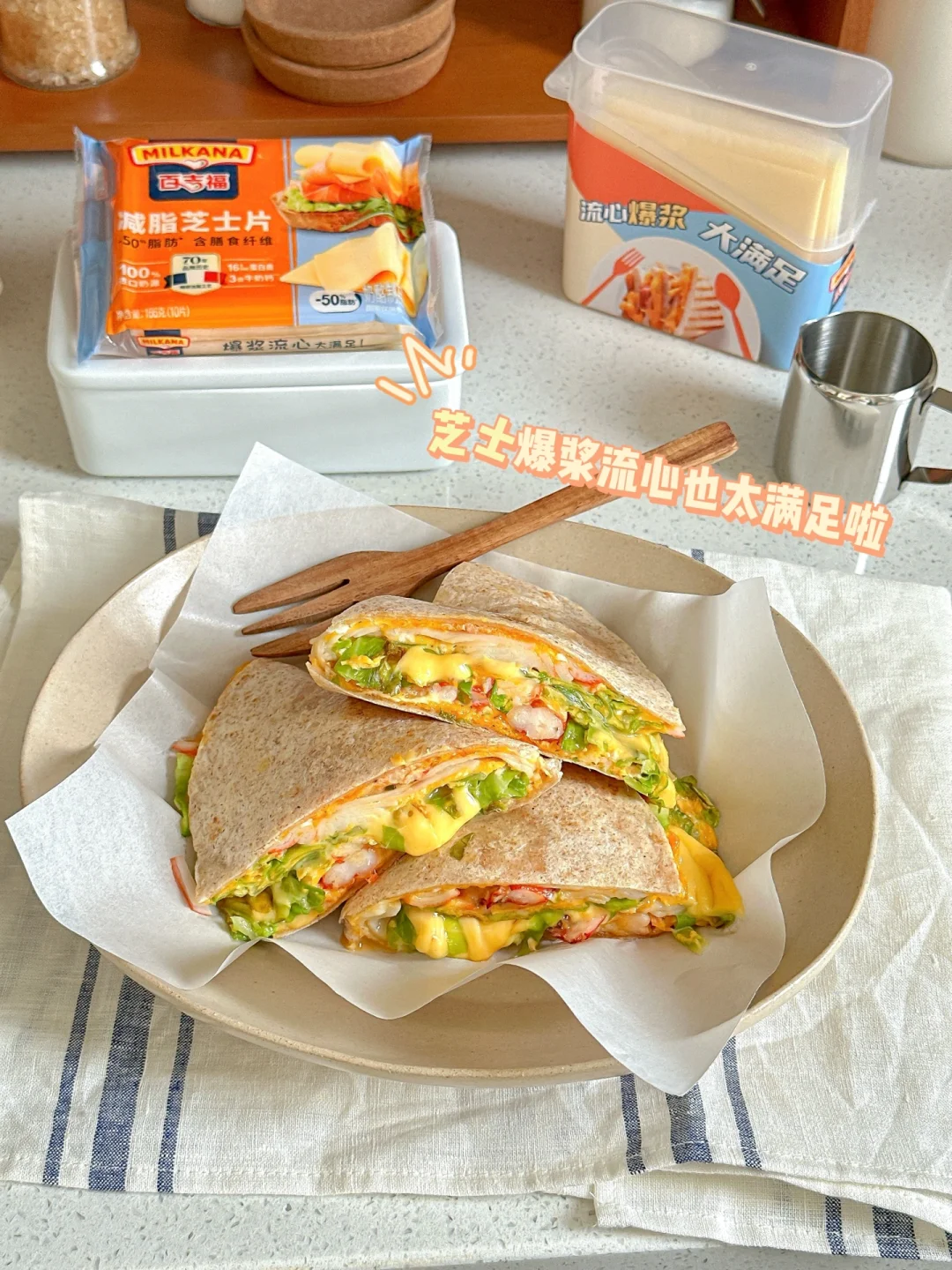 我的5分钟速成早餐,薄薄的饼皮包裹着满满的鸡蛋、虾仁、蔬菜!厚厚的很扎实。一口咬下去,爆浆流心的芝士内陷,奶香超浓郁,口感很丰富~再搭配一杯羽衣甘蓝汁,清新又解腻~