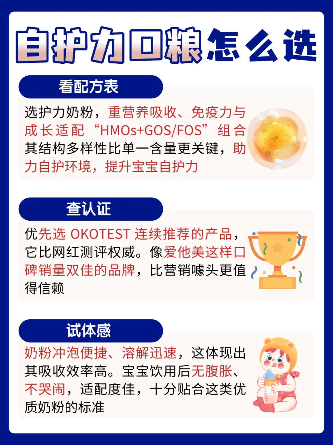 • 看配方表:重点盯“HMOs+GOS/FOS”组合,结构多样性比单一含量更重要,提升自护力才是王道