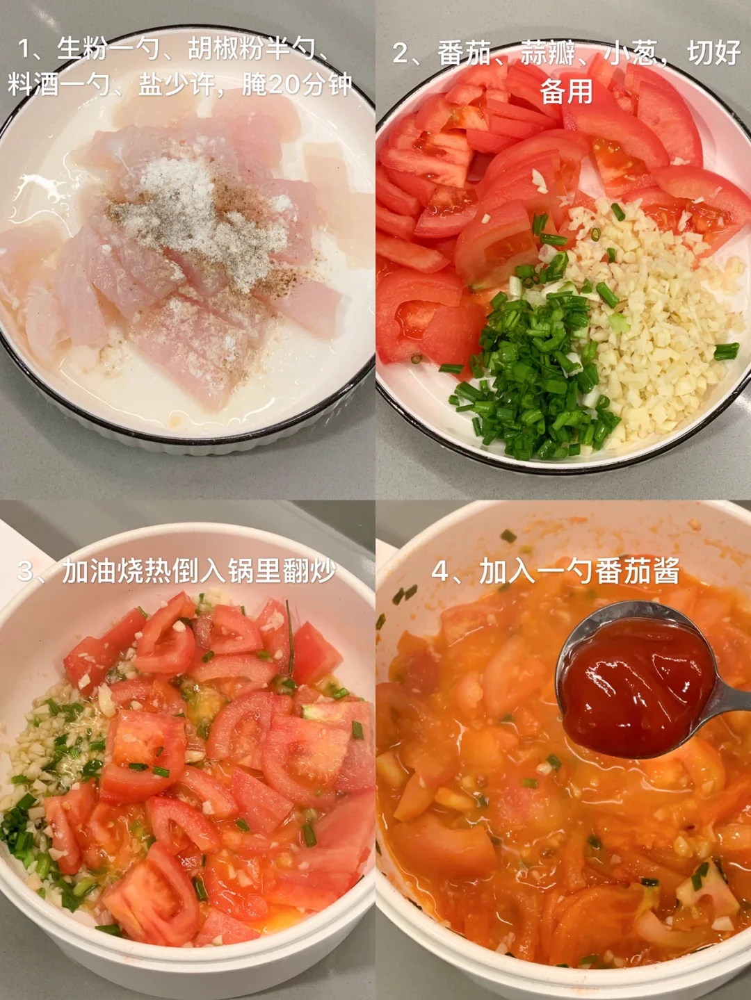 家人们!激动的心!!! 从朋友那学的超好吃的番茄巴沙鱼! 跟饭店的味道可以说是一毛一样! 汤汁浓郁!超下饭!它还低卡高蛋白! ——————— 番茄巴沙鱼 食材: 巴沙鱼、西红柿2个、玉米一段、葱姜蒜一盘 做法: 1、巴沙鱼切块儿!放入一勺料酒、一勺淀粉、半勺胡椒粉、半勺盐!腌制29分钟 2、番茄去皮切块儿!葱蒜切末 3、锅中加油!烧热后倒入番茄、葱蒜!翻炒! 4、炒熟后加入小半碗水煮开!再加入1勺番茄酱!1勺生抽!1勺蚝油!搅拌均匀后!倒入鱼片煮五分钟!即可开吃!