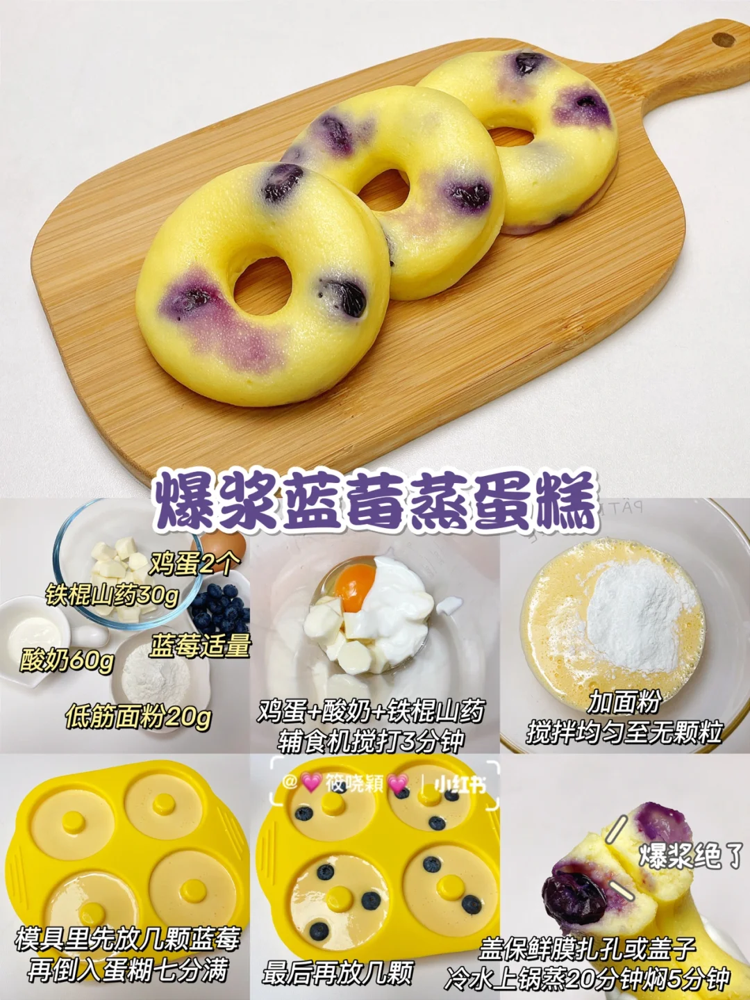 🔸食材:蓝莓适量,鸡蛋2个,铁棍山药30g,酸奶60g,低筋面粉20g
