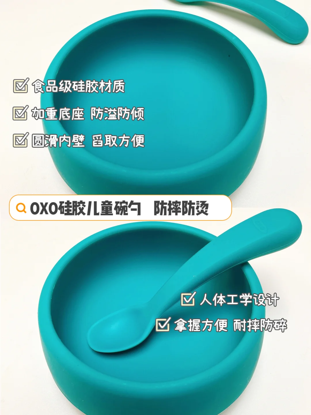 🔸OXO奥秀硅胶碗,自带重量的底座可以将碗稳定在桌上,不易打翻溢出,材质很柔软,很耐摔不易坏。
