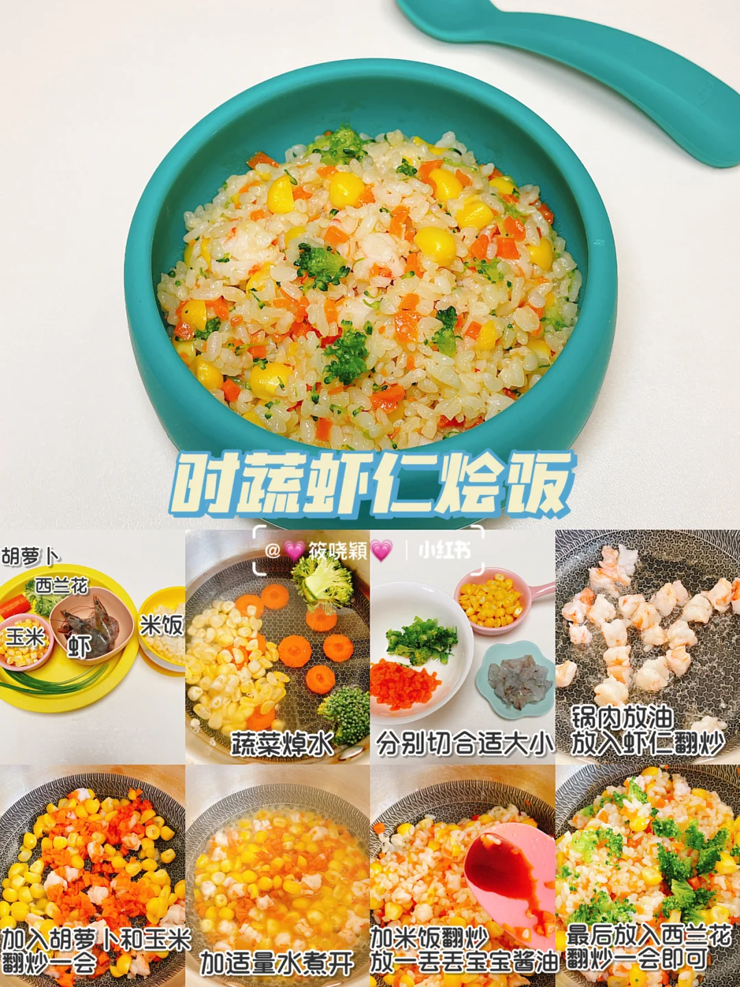 食材:胡萝卜,西兰花,玉米,虾,米饭