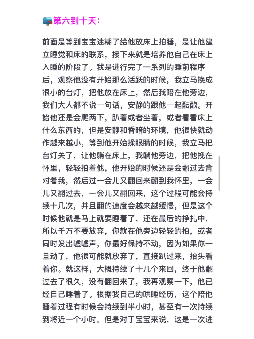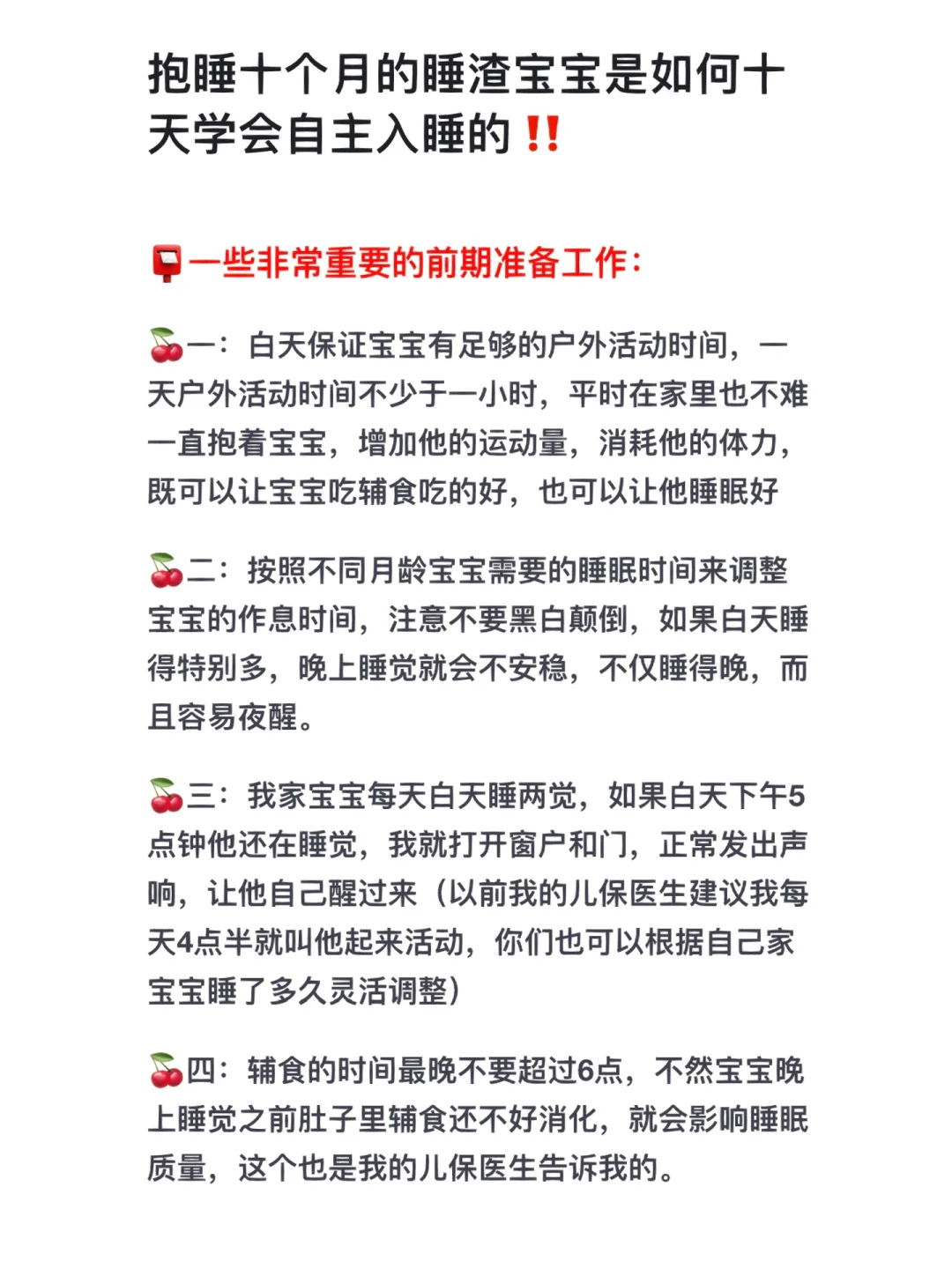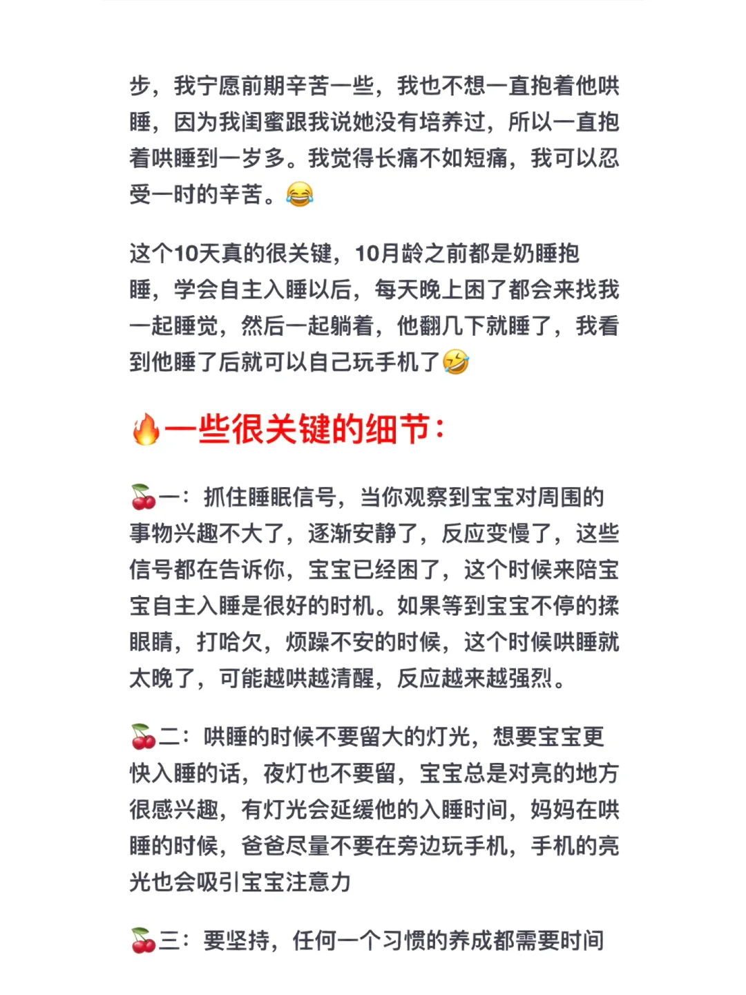 自从看到崔玉涛老师解读的美国儿科学会睡眠手册中培养宝宝自主入睡的方法,我就下定决心开始培养自主入睡,我在崔老师解读的方法的基础上进行了改良,整个过程差不多是10天,从开始的比较艰难,到后面的越来越顺畅,到最后完全习惯了自主入睡,成功的时候,我都激动的要哭了,我一定要把这个方法安利给所有和我一样辛苦哄睡的宝妈们‼️‼️‼️