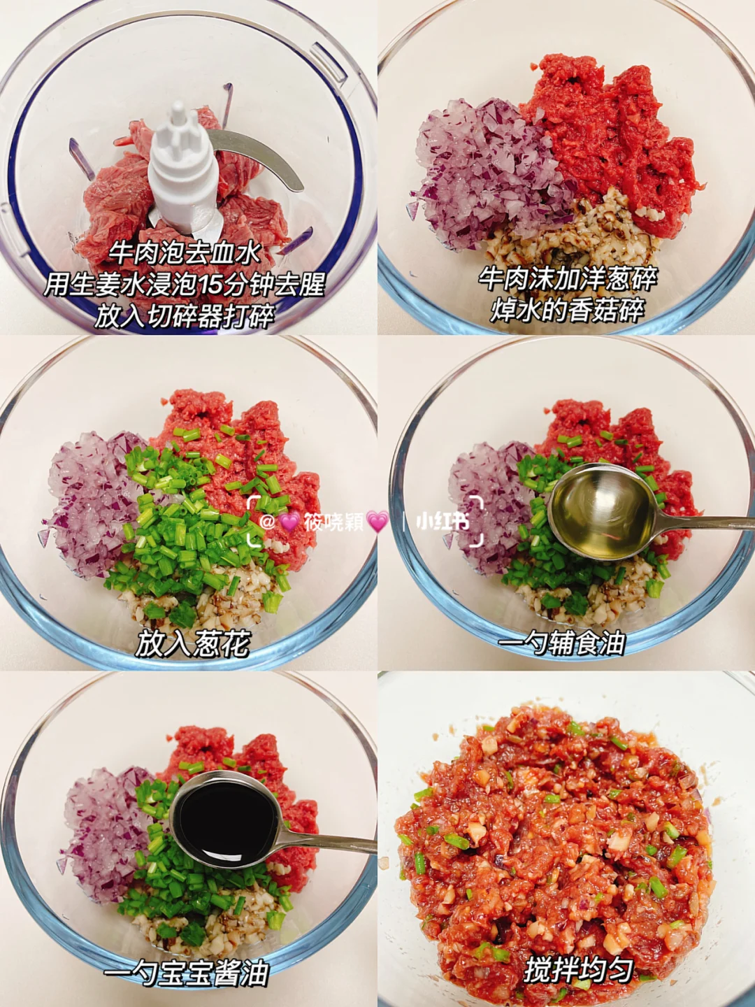 ①牛肉泡去血水,用生姜水浸泡15分钟去腥,放入料理机打碎。