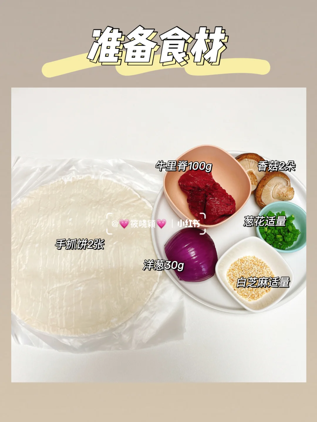 🛒食材:牛里脊100g,洋葱30g,香菇2朵,手抓饼2张,葱花适量,白芝麻适量
