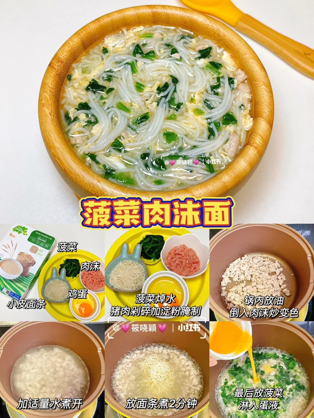 🔸做法:锅内放油肉沫下锅翻炒变色;加适量水煮开,放面条;最后放入菠菜淋入蛋液