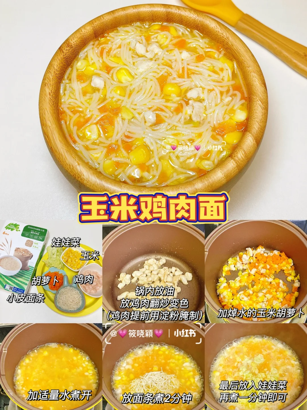 🔸做法:锅内放油,加鸡肉翻炒变色;放入胡萝卜和玉米;加适量水煮开;放面条,最后放入娃娃菜再煮1分钟