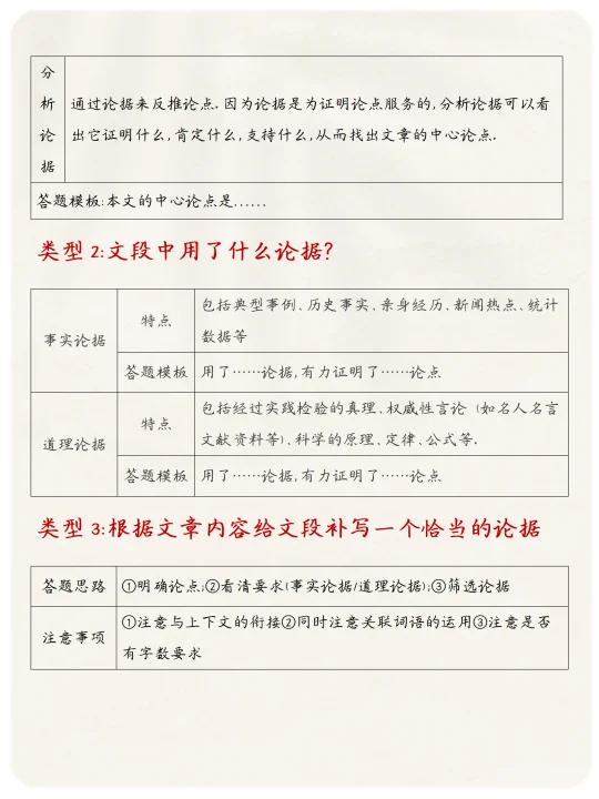 技巧:先判断是事实论据还是道理论据,再看它支撑的是中心论点还是分论点。