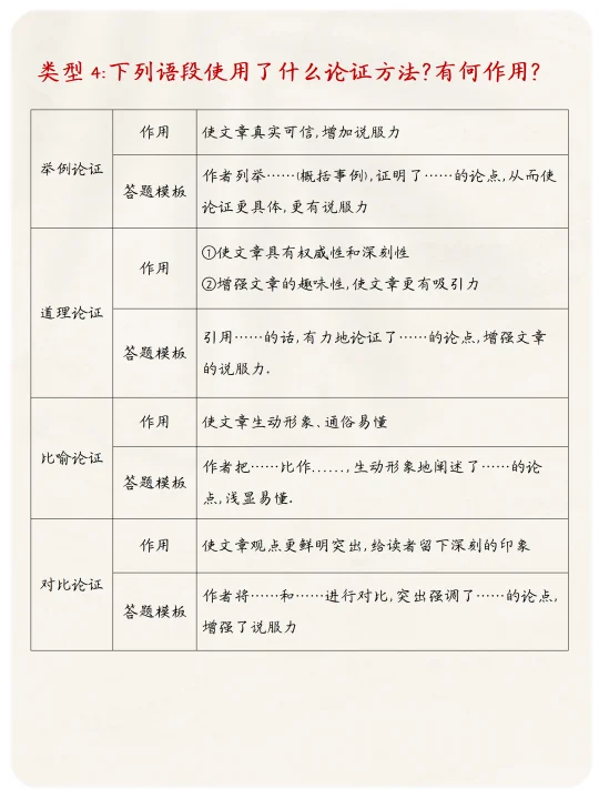 技巧:先找准方法(注意:有时会用多种方法,要全写),再套上面的 “论证方法模板”。