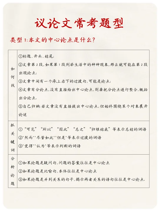 技巧:先看标题(如果标题是观点,比如《应有格物致知精神》,直接就是论点);再看开头结尾;若都没有,找分论点整合,或通过论据反推(论据证明什么,什么就是论点)。 答题模板:本文的中心论点是......