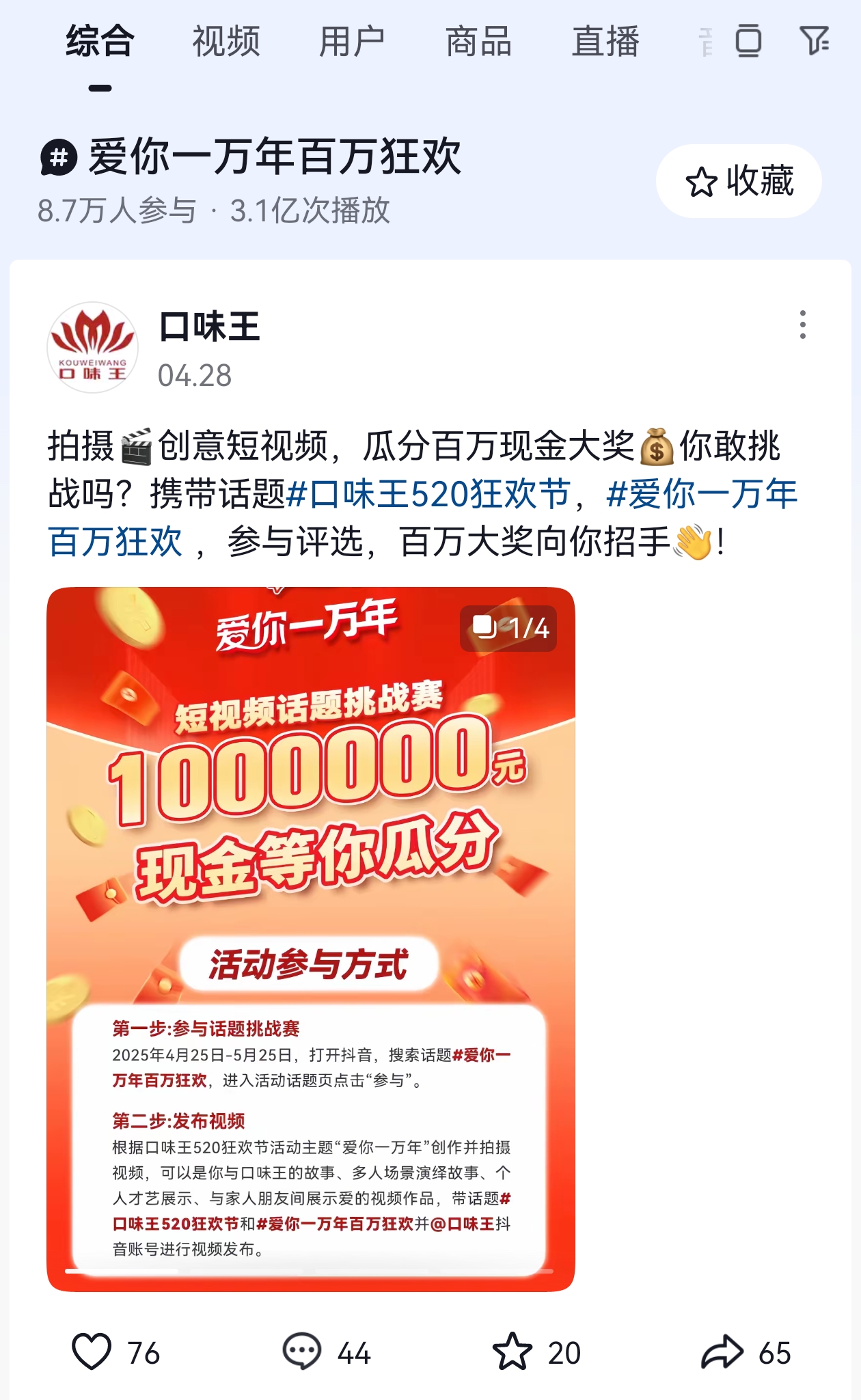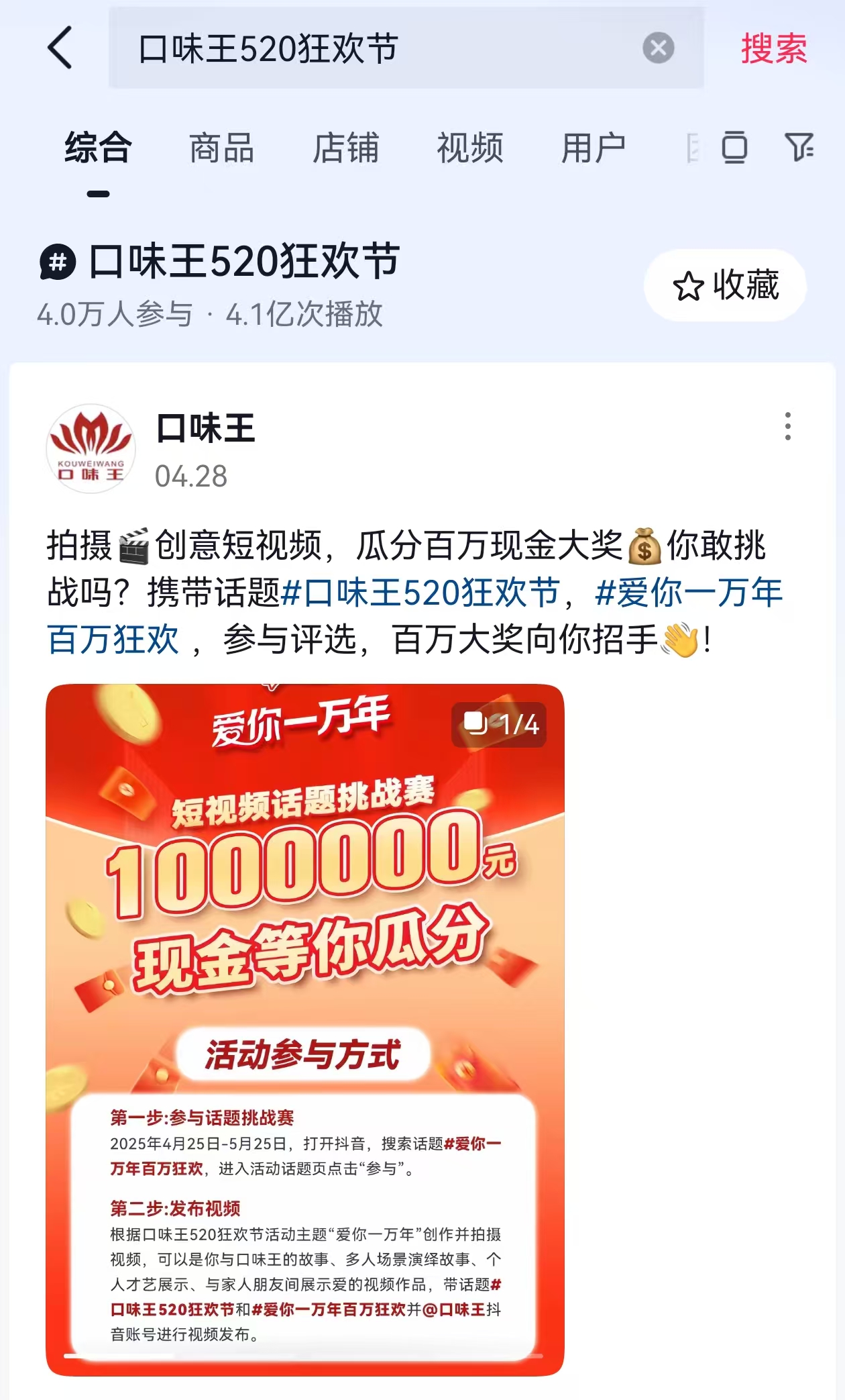 据大河报·豫视频记者调查发现,以“口味王”品牌logo为头像的账号百余个,其中,“口味王”账号在今年4月,在某音平台发起了520短视频话题挑战,而其话题#口味王520狂欢节与#爱你一万年百万狂欢有12.7万人参与,流量高达7亿。