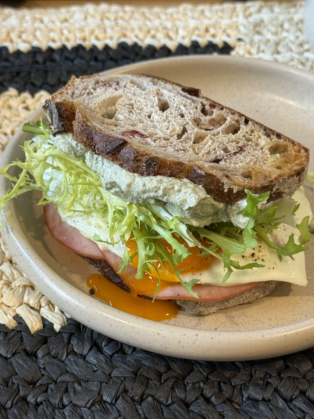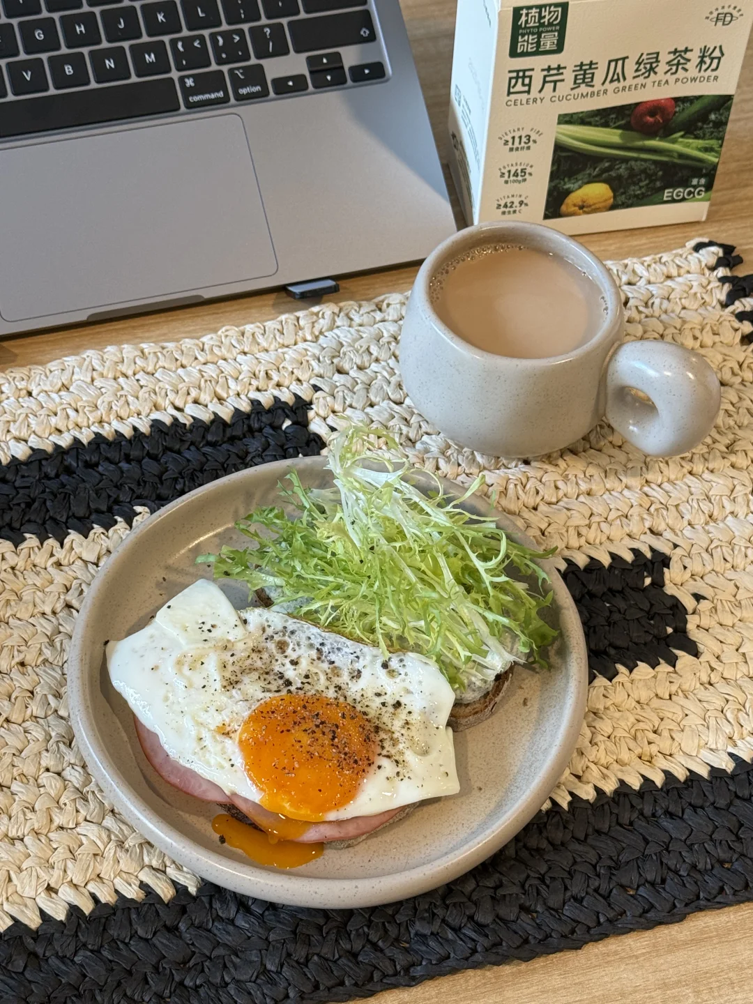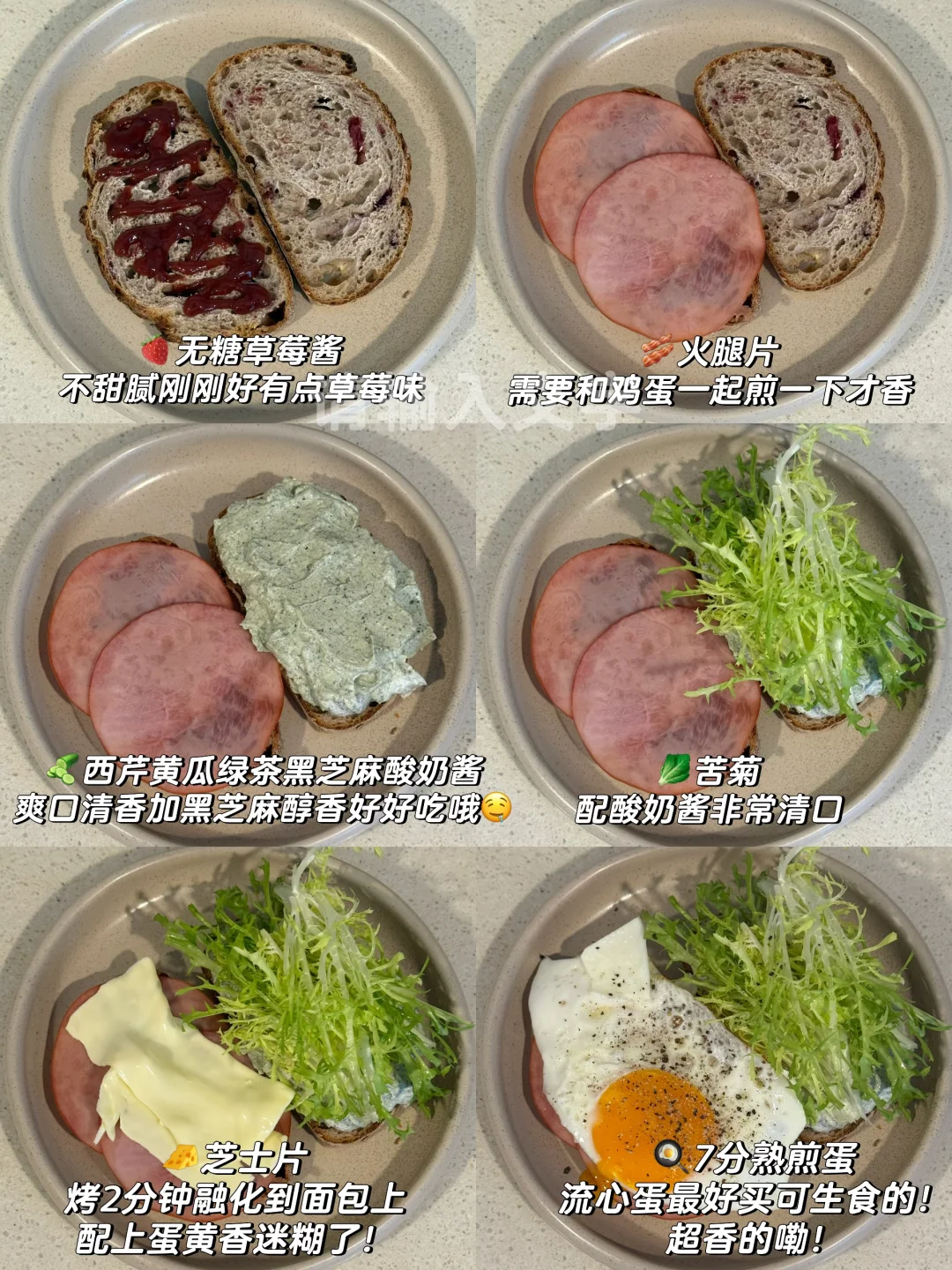 📍佛系养生D378 初始:56.6kg 今早:54kg 【早餐】 🍓无糖草莓酱,不甜腻刚刚好有点草莓味 🥓火腿片需要和鸡蛋一起煎一下才香 🥒西芹黄瓜绿茶黑芝麻酸奶酱,爽口清香加黑芝麻醇香好好吃哦🤤 🥬苦菊,配酸奶酱非常清口 🧀芝士片烤2分钟融化到面包上,配上蛋黄香迷糊了! 🍳7分熟煎蛋,流心蛋最好买可生食的!超香的嘞! ☕️燕麦拿铁