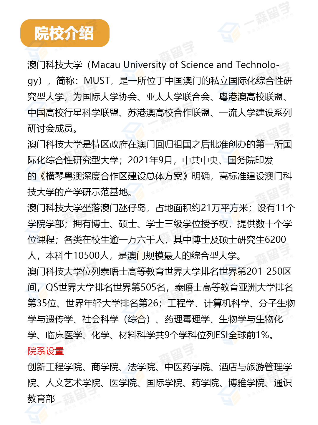 本科申请要求 符合以下资格,申请人可通过「直接入学(应届高考生)」途径报读: A.持有中国内地居民身份证 B.普通高中三年级毕业或同等学历以上 C.参加普通高等学校招生全国统一考试(高考) D.报读艺术学-艺术设计或数位媒体艺术学士学位课程的申请人,必须持有2024年省级美术类专业统考成绩 F.艺术生及普通生均可报读影视制作及表演艺术学士学位课程 G.报读内外全科医学学士学位课程之申请人,应届高考总分须达省划本科第一批次/特殊类型招生录取控制线以上 申请流程 申请人必须于指定报名期内通过网上报名系统完成相关手续: 检查报读资格 开户及登入网上报名系统 阅读「网上报名指引及须知」 填报/上载报名资料 提交网上报名申请 缴交报名费600元港币 获得申请编号 填报高考资料 参加专业面试(如适用) 研究生申请 申请条件: 申请硕士学位课程必须有学士学位,应届或往届毕业生均可申请 申请博士学位课程必须有硕士学位 澳门科技大学的大部分专业对语言无强制要求,条件满足的申请人会参加学校的面试 法学、中医学、中药学、中西医结合临床医学、护理学需要参加面试及笔试
