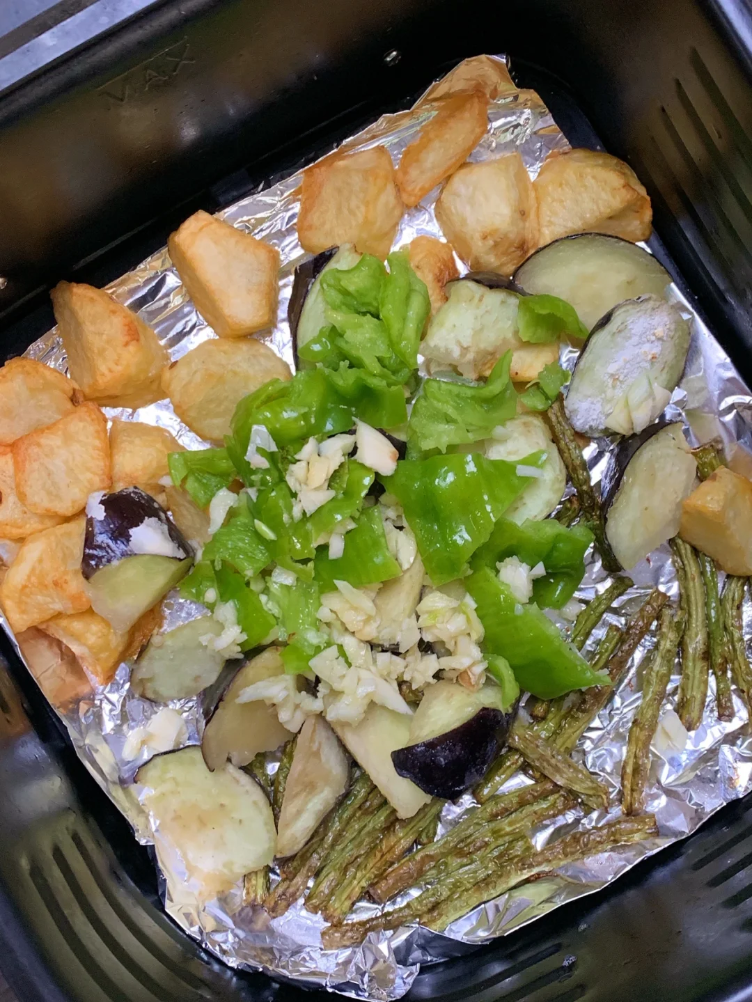 2、刷好油的土豆空气炸锅180°C烤10分钟后翻面!加入豇豆10-起考分钟!再加入茄子!青椒!大蒜!烤3分钟!!(中 途翻面)