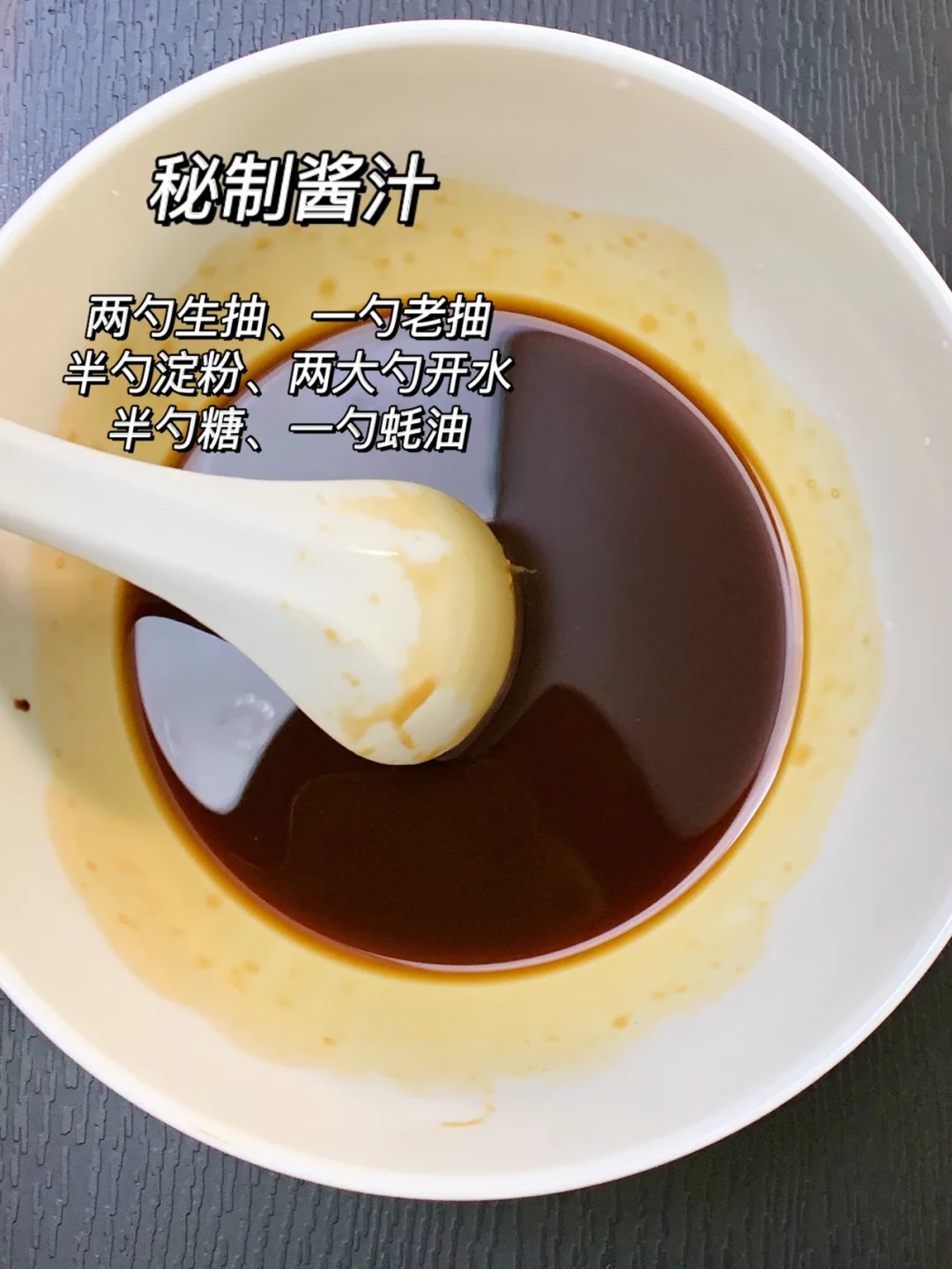 生抽2勺、老抽1勺、糖半勺、淀粉1勺、蚝油1勺、开水5勺