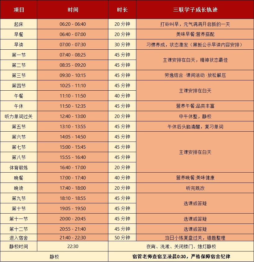 专职班主任全程跟踪,手机统一保管,作息标准化(7:00-22:30学习时段)。每日重点日日清,每周限时周练,每月月考分析都会量化数据,让学生每一次的进步都可以具象化,确保学习效果落地。