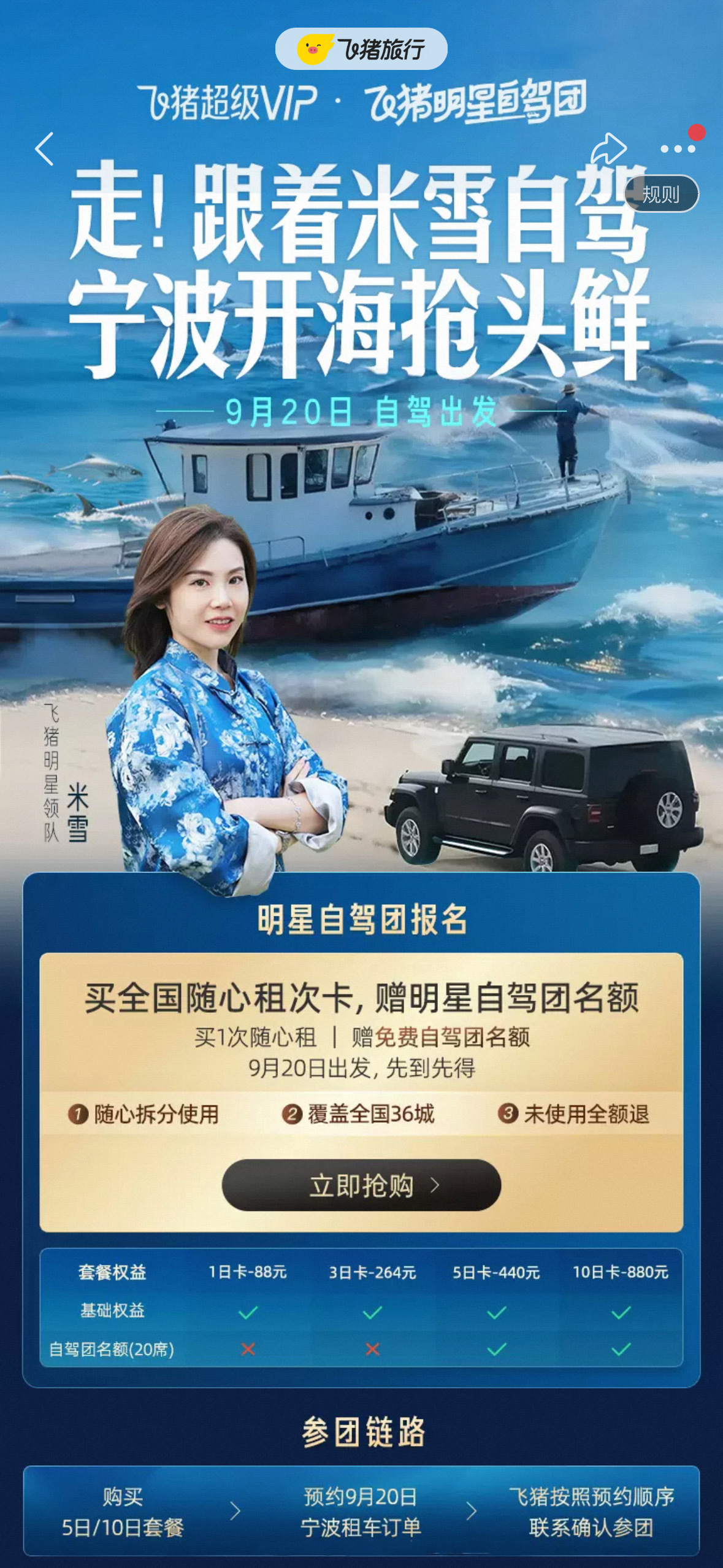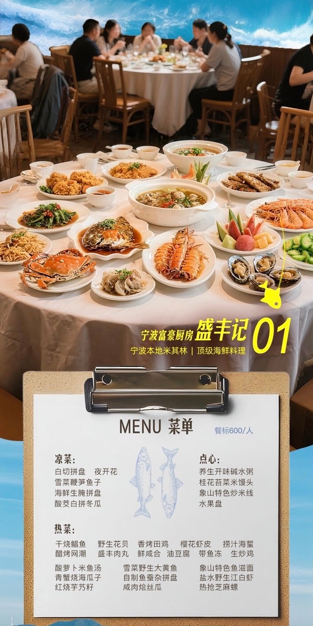 飞猪米雪独家定制开海抢鲜自驾团开海必吃榜!这份海鲜自由攻略请查收!背靠东海循鲜而来,无论是饱满鲜甜的梭子蟹,还是一口入魂的顶级黄鱼,宁波人民的饭张力一定能满足你的味蕾。飞猪搜索【明星自驾团】,购买440元随心租5日卡,免费解锁参团资格!9月20日和明星领队一起寻味宁波!开海季直奔潮头第一鲜,还有600元餐标盛丰记海鲜宴,一顿饭直接回本,实现海鲜自由!