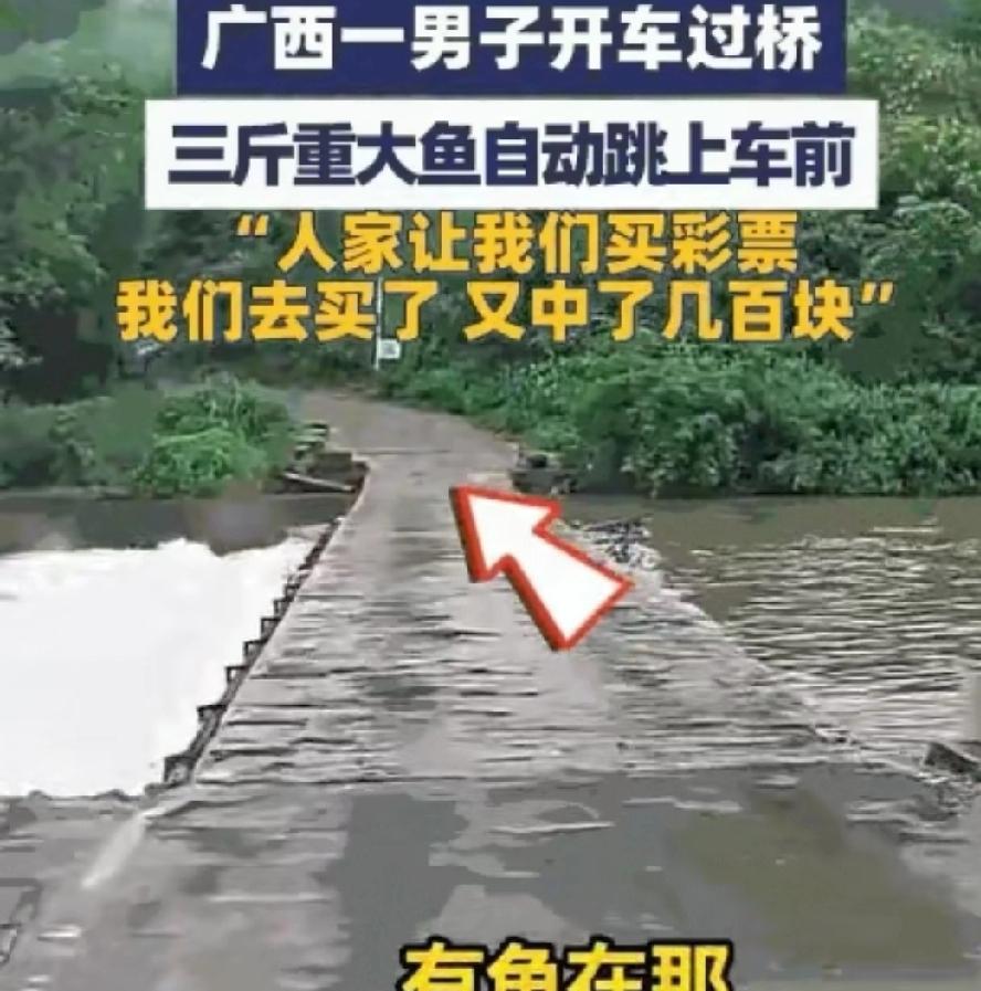 9月9日,广西桂林。这天是陈先生的幸运日。他开车和朋友出行,经过一座小桥时,就在车的前面,一条足有3斤重的大鱼摇头摆尾,忽然跃到了桥上。这座桥建了几十年了,还没见过鱼会自动跃到桥上。 陈先生和朋友连忙下车,手忙脚乱的把鱼捕获了。朋友兴奋的说,今天运气太好了,买彩票肯定会中奖。陈先生决定去试一下手气,还真的让朋友说中了,中了几百块钱的奖。 人逢喜事精神爽,陈先生今天是要风得风,要雨得雨。开个车,鱼自动送到车来,买个彩票又到手几百块钱,今天的日子太爽了。