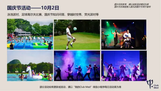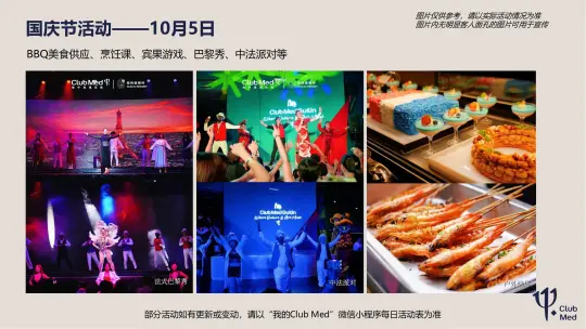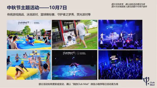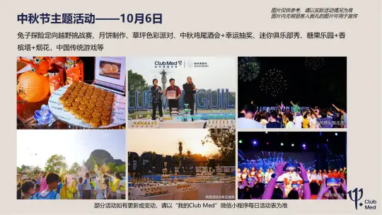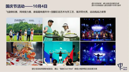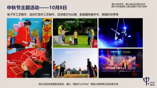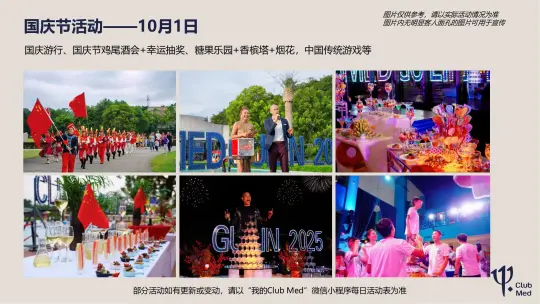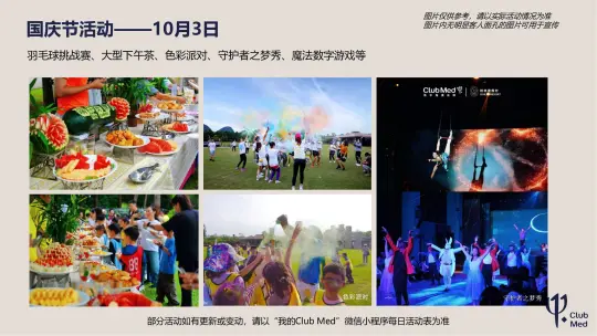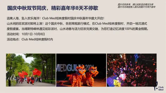 逃离人海,坠入欢乐海洋!Club Med桂林度假村国庆中秋嘉年华盛大开启! 山水间的狂欢派对即将上演!这个国庆中秋,告别常规旅行模式,在Club Med桂林度假村,开启一场沉浸式 度假盛宴。当喀斯特峰林遇见炫彩派对,山水诗意与活力狂欢完美交融,为您打造记忆浓度100%的黄金假期。 活动时间:10月1日-10月8日 活动地点:Club Med桂林度假村内 每天都有加倍丰富精彩的活动 还在犹豫什么?国庆就去桂林度假村狂欢吧!