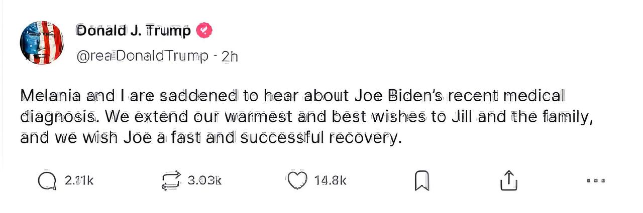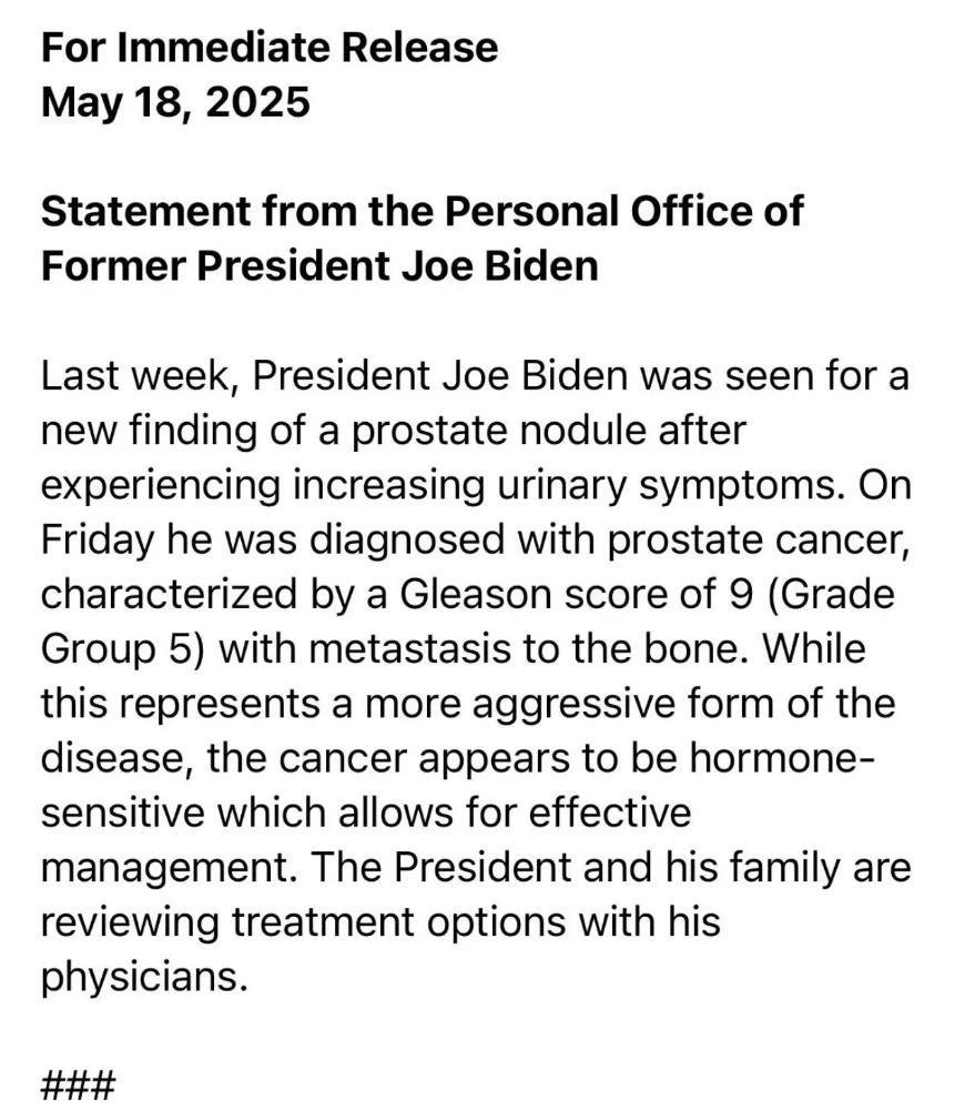 82岁拜登确诊前列腺癌且已扩散,特朗普等政界大佬寄语:早日康复! 当地时间5月18日,美国前总统拜登办公室发布一份声明——82岁的拜登被官宣确诊高侵袭性前列腺癌,癌细胞更是扩散到了骨骼。 起因是拜登最近总觉得排尿困难,扛不住了才跑去医院。医生一检查,好家伙,前列腺上冒出个新结节! 经过两天的加急评估,16号最终确诊——这病来势汹汹,Gleason评分直接飙到9分(第5级),属于“难搞”的癌症类型。 想象一下,拜登一家刚听到这个消息时,心里估计跟坐过山车似的,又惊又慌。不过转机也随之而来,声明里提到这种癌症居然对激素治疗有反应! 只要治疗方案到位,还是有希望把病情稳住的。现在拜登全家正和医疗团队凑在一块儿,翻遍各种资料,绞尽脑汁研究最佳治疗方案,恨不得把每个细节都抠清楚。 消息传开后,最让人意想不到的是老对手特朗普的反应。往常特朗普在社交媒体上怼拜登那叫一个“火力全开”。 结果这次,他居然画风突变,不仅没开嘲讽,还带着夫人发文表示“悲痛”,字里行间全是祝福,盼着拜登能快点好起来。 在这样关乎健康的大事面前,特朗普能展现出这样的姿态,也算是给紧张的美国政坛氛围带来了一丝别样的气息。 回想起拜登的政治生涯,也是充满了起起落落。他曾是美国最年轻的参议员之一,在政治舞台上摸爬滚打多年,经历了无数的政治风浪。 好不容易当上了总统,在任期内也面临着各种各样的难题和挑战,从国内的经济问题、疫情防控,到国际上的外交关系、地缘政治冲突等等,可谓是压力重重。 而他的身体状况,其实一直以来也备受外界关注。之前就有各种传闻,说他身体出现了一些状况. 像是在一些公开场合,他的表现让人感觉状态不太好,甚至还有新书爆料他执政后期认知急剧下降,在一些活动中连老朋友都认不出来。 如今,确诊前列腺癌的消息更是让大家对他的未来充满了担忧。不过,咱们还是得往好的方面看。 既然这种癌症对激素治疗有反应,那说明还是有希望通过有效的治疗来控制病情的。希望拜登能够积极配合治疗,战胜病魔。 毕竟,不管他在政治上有怎样的作为,在面对疾病的时候,他也只是一个需要与病魔顽强抗争的普通人。 未来,我们也将持续关注拜登的治疗进展和身体状况,看看这场与癌症的战斗会走向怎样的结局。