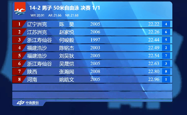 江苏队的赵家悦游出22秒26,获得银牌;浙江队的何峻毅以22秒44的成绩获得铜牌。
