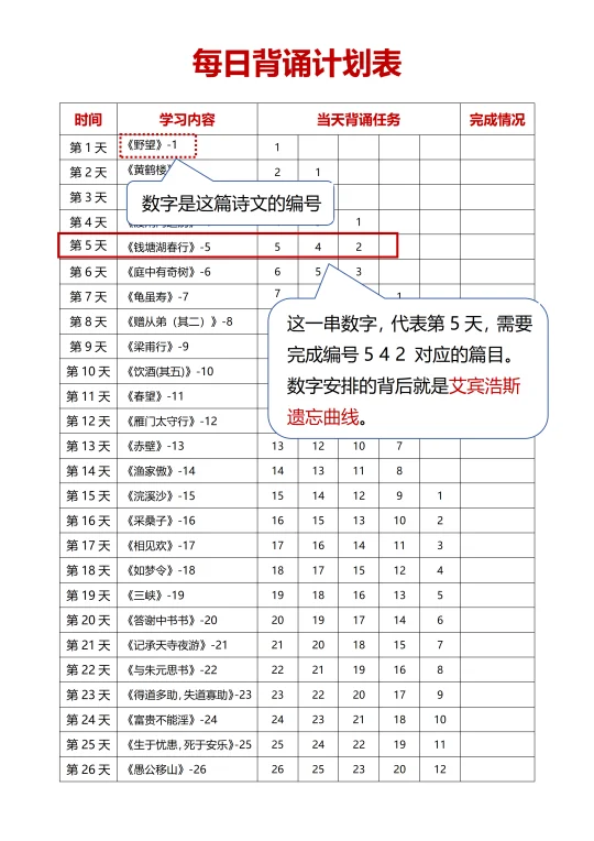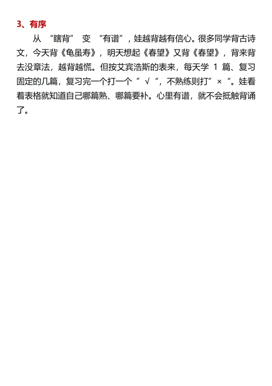 从 “瞎背” 变 “有谱”,娃越背越有信心。很多同学背古诗文,今天背《龟虽寿》,明天想起《春望》又背《春望》,背来背去没章法,越背越慌。但按艾宾浩斯的表来,每天学 1 篇、复习固定的几篇,复习完一个打一个✔,不熟练则打“×”。娃看着表格就知道自己哪篇熟、哪篇要补。心里有谱,就不会抵触背诵了。