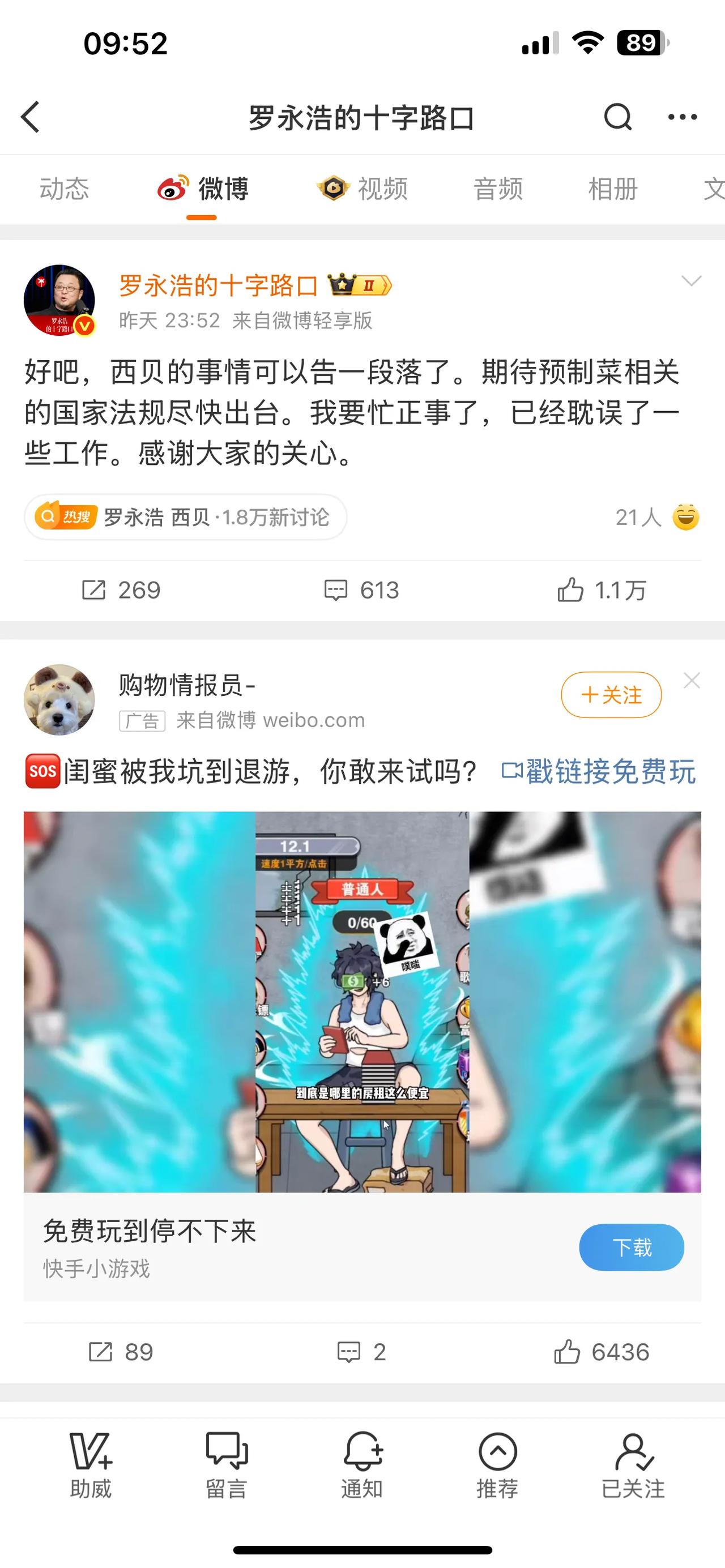 9月13日晚,罗永浩微博最新发文称西贝的事情可以告一段落了,全文如下:好吧,西贝的事情可以告一段落了。期待预制菜相关的国家法规尽快出台。我要忙正事了,已经耽误了一些工作。感谢大家的关心。