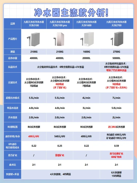 天净 2100 Pro :2100的升级版,新增矿化功能,8层精滤水质清甜,香槟粉外观超吸睛。