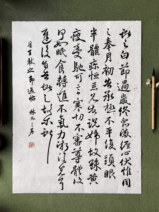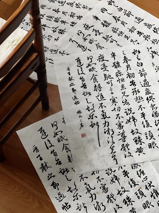 一遍,换了洒金宣和作品墨,心情立刻不一样,还是宣纸有呼吸感,但写完回头看,每个字像是单蹦出来,完全不记得写碑需要有自己的理解,自然书写表达笔势的连带;二遍,慢慢找到发力点,但被原章法弄得束手束脚,每每写到一行的后几个字总是憋屈,写完又觉得整篇横宽的尺幅比例不美;裁了张竖幅的纸,胡来了第三遍,惊喜终于有了点行气,自由带来自然,但略挤了,行尾过于高低不齐;四遍,矫枉过正,本想在这一遍停止,但行距宽了,字也呆板不灵动;结合上两遍的经验开始了第五遍,写好落款,本以为学篆刻已过了盖印关,结果一个没按稳,印章竟然折飞出去,真是要好好收敛心神了。