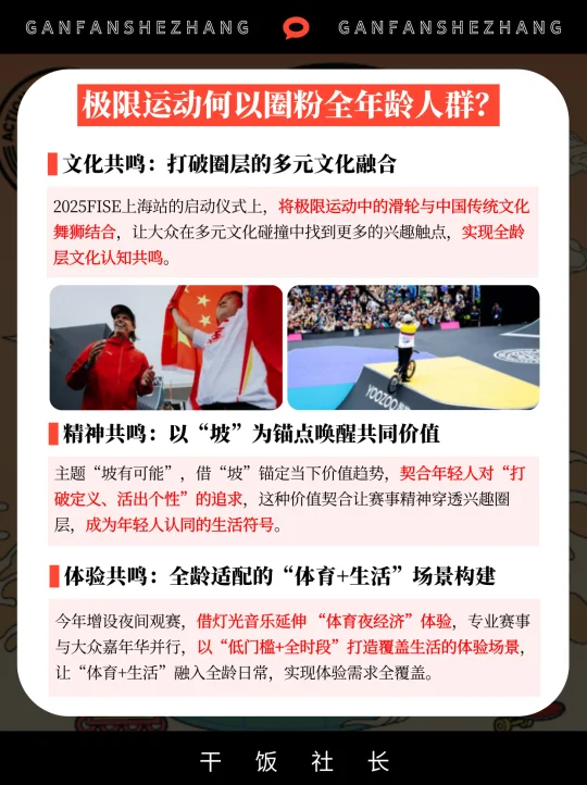 在中国,城市极限运动正从小众爱好向大众兴趣快速跃迁,社交平台上 街头滑板日常 城市小轮车挑战 等话题曝光量持续攀升,而传统运动场景已难以满足大众对“观赛+体验+社交+消费”的一体化诉求,FISE的到来精准切入这一市场空白
