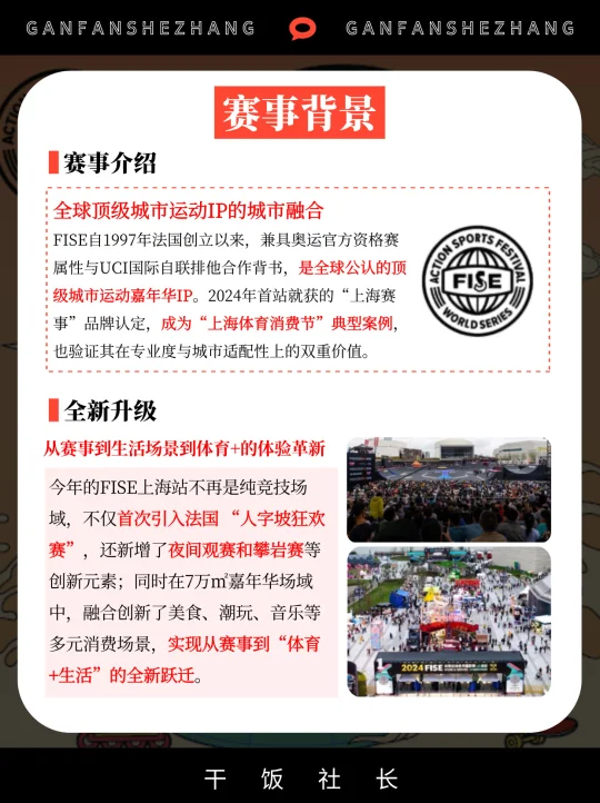 今年10月上海将迎来一场世界级城市运动盛宴🔥2025 FISE极限运动世界巡回赛上海站暨FISE城市运动嘉年华。这场源自法国、拥有28年历史的全球最大规模综合性极限运动IP,不仅带着赛事升级的全新活力回归,更以“坡有可能”为主题,将极限运动的精神内核与大众生活态度相联结。同时,其打造的70000㎡沉浸式嘉年华场景,全天候开放。在破圈传播、唤醒生活场景、撬动“体育+”的跨界融合消费生态方面,打开更广阔的想象空间。