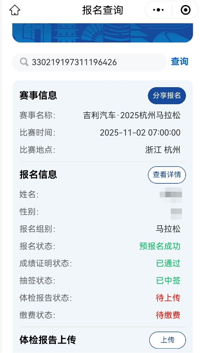 马拉松和半程马拉松中签者及候补选手须及时上传体检报告,如由于缺少资料审核未通过,可在此期间重新递交。